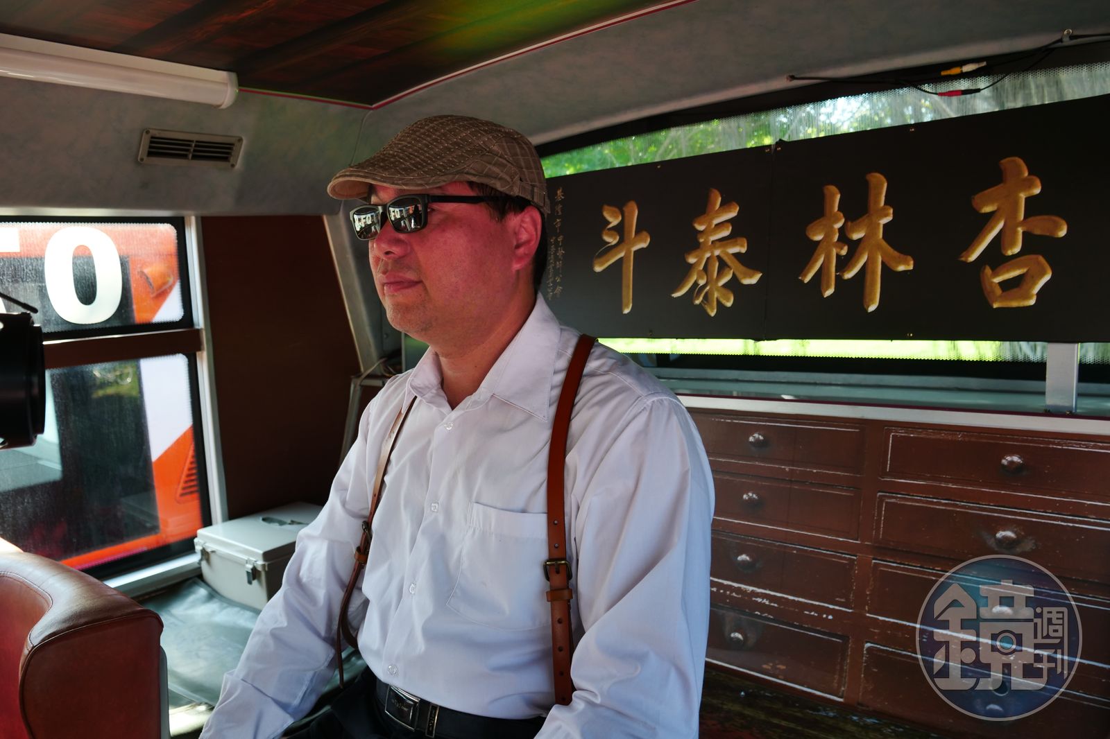 到底葫蘆裡賣啥藥?這是主打舊城觀光的綠17線,從車廂場景到司機造型,宛如時代劇。「郭雪湖筆下的《南街殷賑》,只剩2個場景還存在,一個是霞海城隍廟,另一個是中藥行。」高宇宏帥氣壓低鴨舌畫家帽,清了清喉嚨又說,「這間中藥行叫『乾元行』,西元1896年就開始營運,公車內裝就是以百年中藥行為範本。」