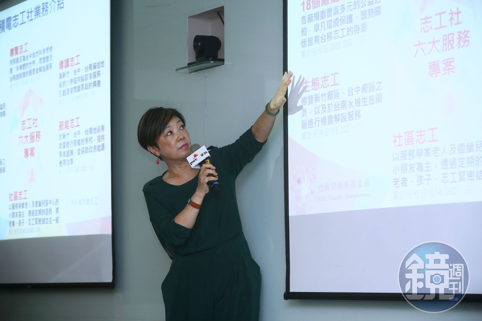 近年來,高雄氣爆、八八風災和花蓮震災等公益活動都可以看到台積電慈善基金會的身影,張淑芬表示,她投入台積電志工活動已經9年,台積電志工社業務也從早期的四個項目,逐漸擴張到目前已經有6大服務,包括導讀志工、導覽志工、節能志工、社區志工和生態志工等等。