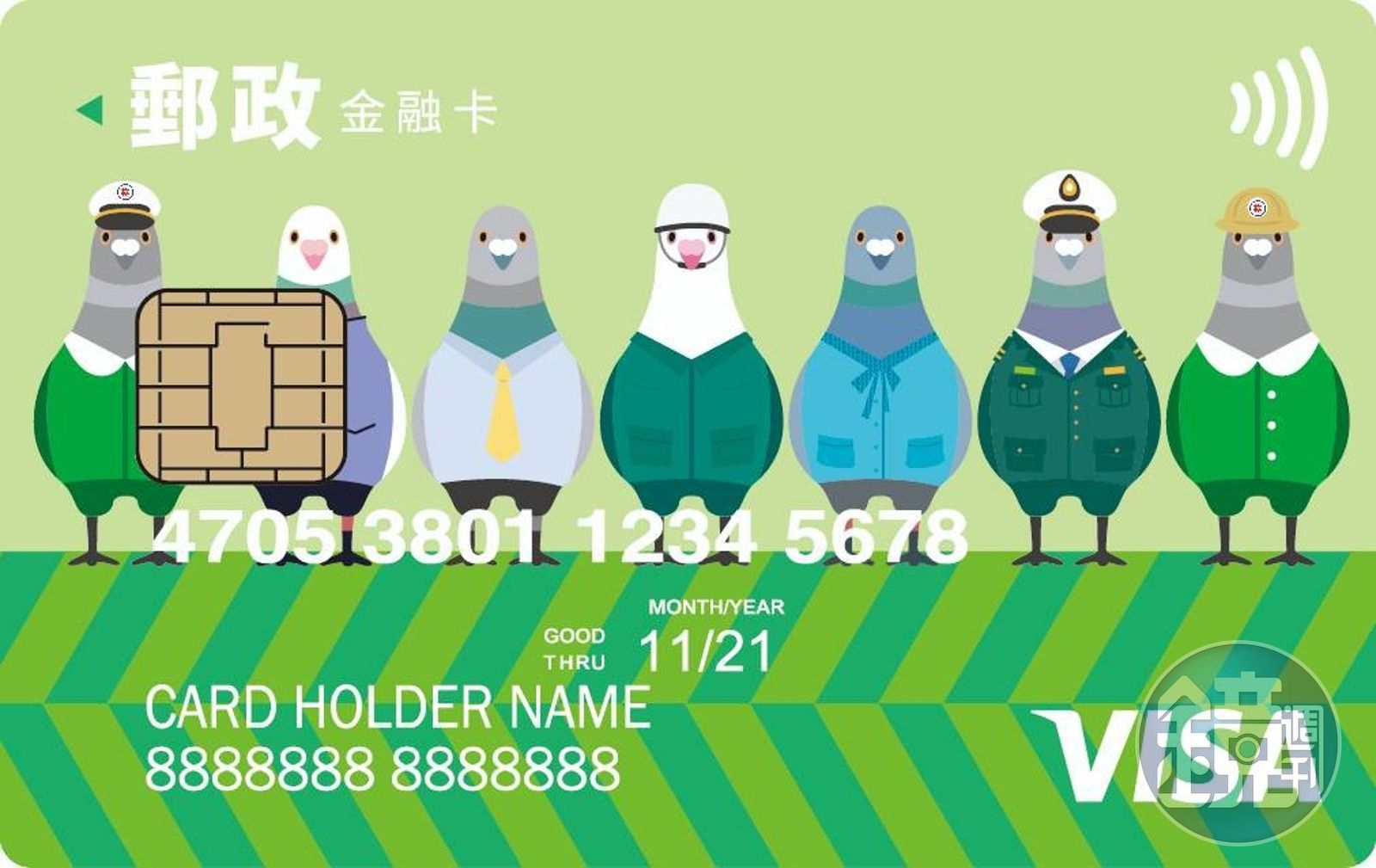 中華郵政將於8月3日開始,推出感應式郵政VISA金融卡,還提供2種不同款式供民眾選擇,一張為鴿子穿著郵差裝的綠色卡,另一張則印有大大金色「郵」字的紫色卡,許多網友看完設計戲稱「根本就是seafood卡!」