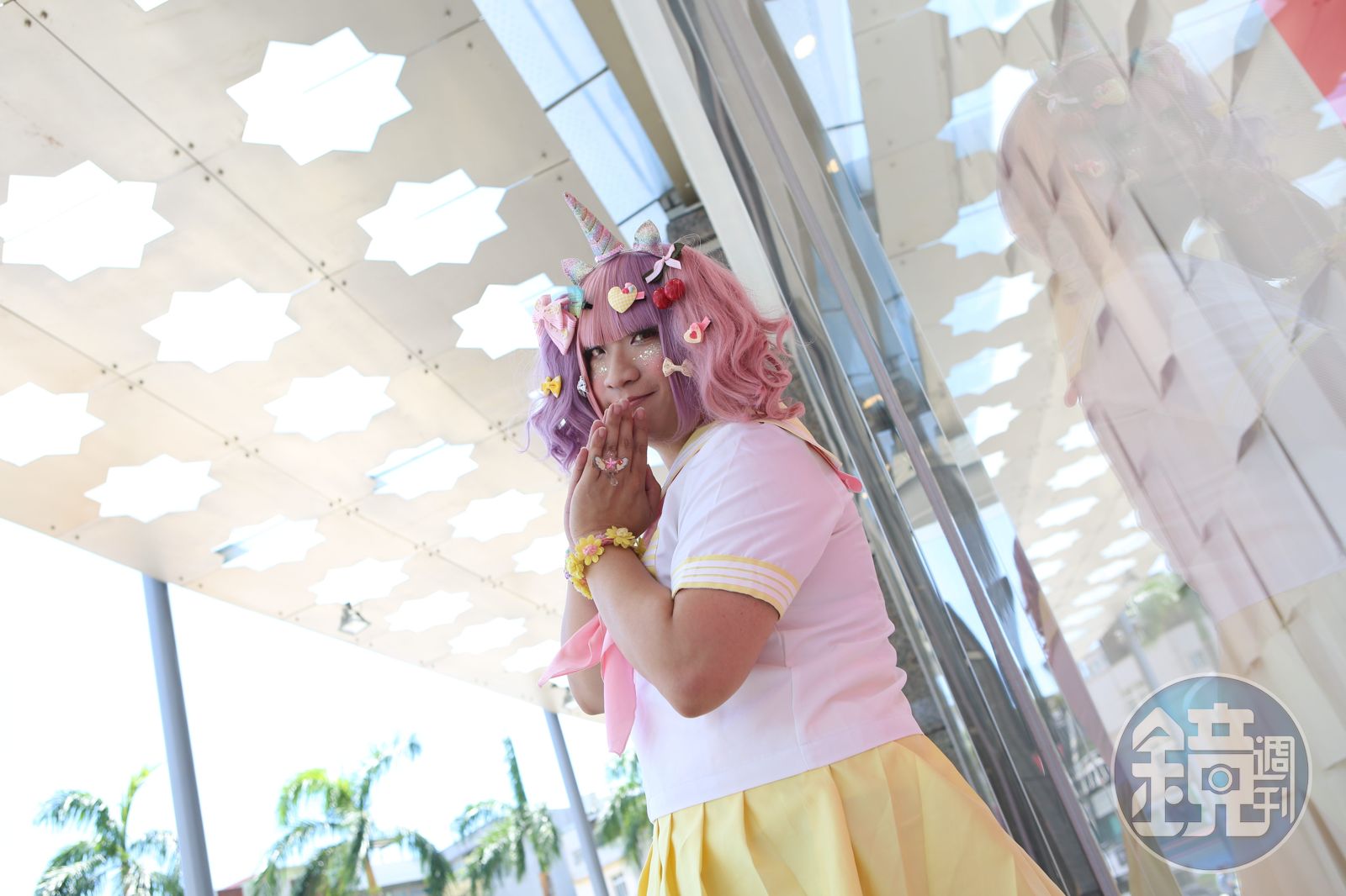 現在的日子也是開心,只是這個開心得來不易。目前仍是生理男性的她,穿著粉色水手服,變色雙馬尾假髮,眼窩拍滿金粉,頭髮上夾了7個蝴蝶結:「有次因為便宜,我買了一盒蝴蝶結,結果就愈戴愈多,現在滿滿一格櫃子都是蝴蝶結。」我們在新竹的購物中心拍照,她毫不顧忌他人眼光,擺出各種可愛姿勢,連警衛阿伯都出來關切了。
