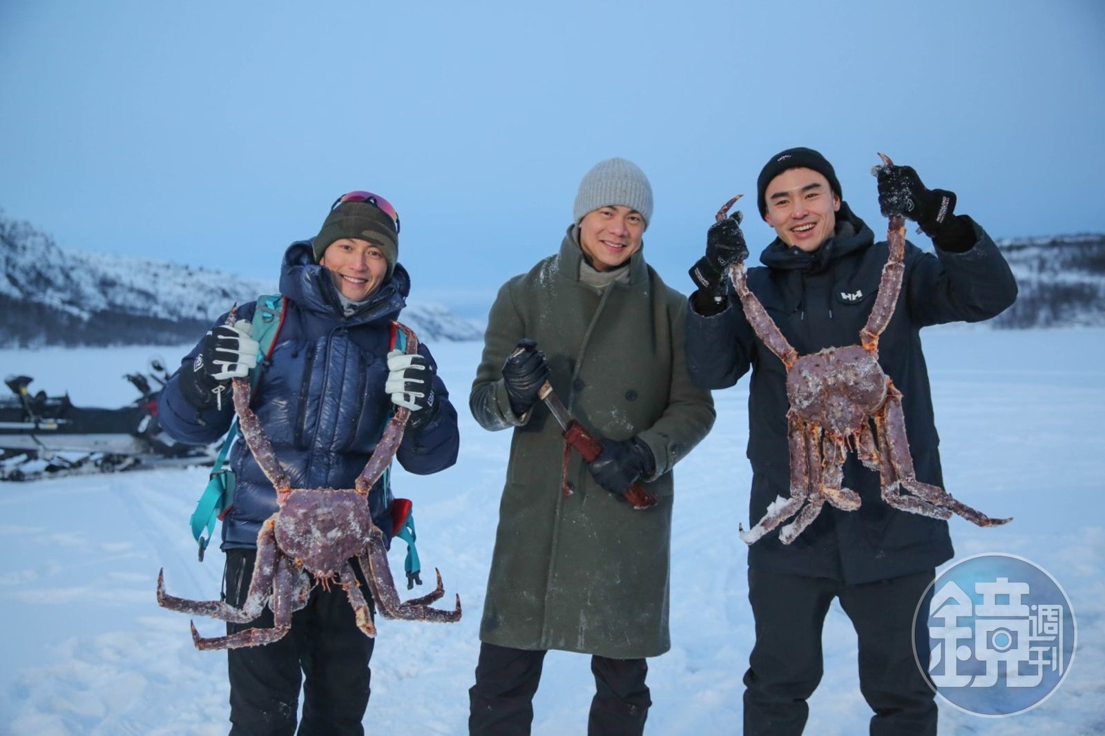 謝霆鋒(左)、阮經天(右)和江振誠組成新一代「抓蟹」男團,在北極海岸上成功捕獲數隻特大帝王蟹。(亞旅提供)發布時間:2018.07.25 15:49 臺北時間