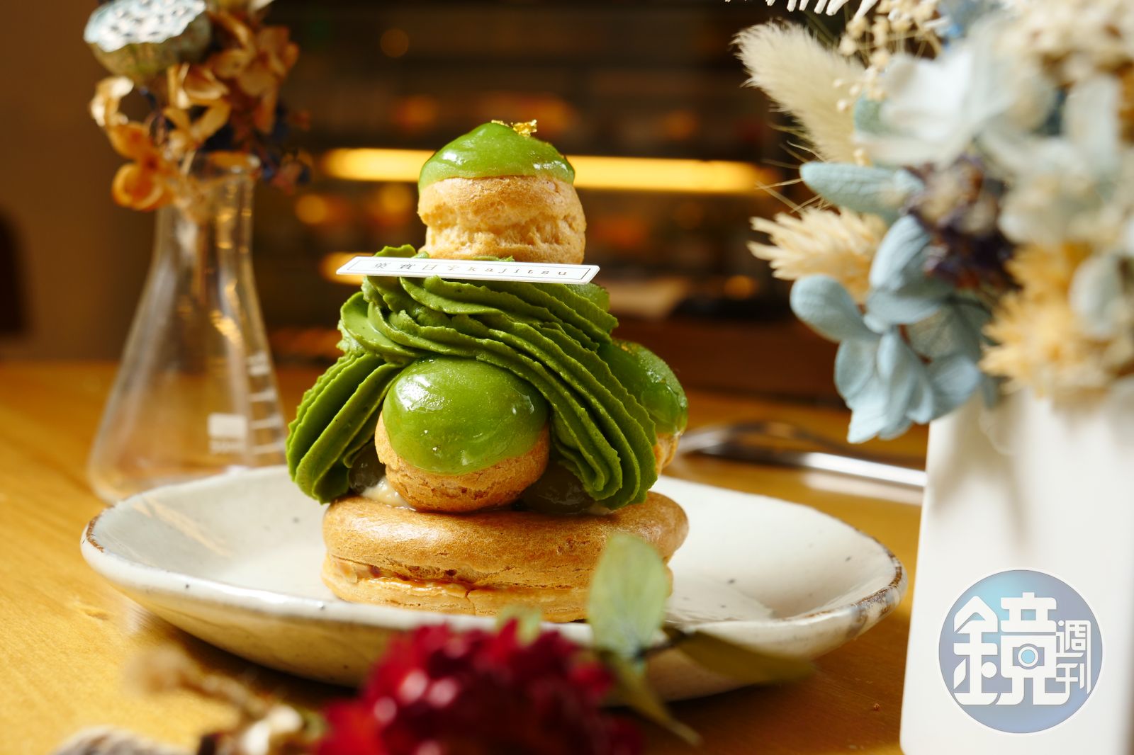 想嘗工藝級法式甜點,最推法式甜點「聖多諾黑」造型的「抹茶珍珠半糖去冰」,靜岡西尾有機抹茶鮮奶油擠得高高,面對泡芙塔,就要果敢、毫不猶豫地把抹茶泡芙蘸滿鮮奶油,入口才療癒,底座大泡芙裡還有綠茶珍珠,風味更有層次。