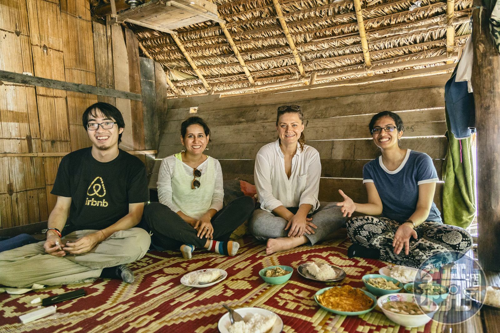 Pat給遊客的體驗非常寫實,我們跟著當地人學習使用穀物盤,均勻有序的灑下飼料餵養家畜,也能捲起褲管,踩進田裡彎著腰來插秧。最有趣的是爬上高腳屋,席地坐在他們手工編織的布毯上,村裡的男人端著一盤盤樸素盛盤的煎蛋、雞肉與豆子等菜餚。