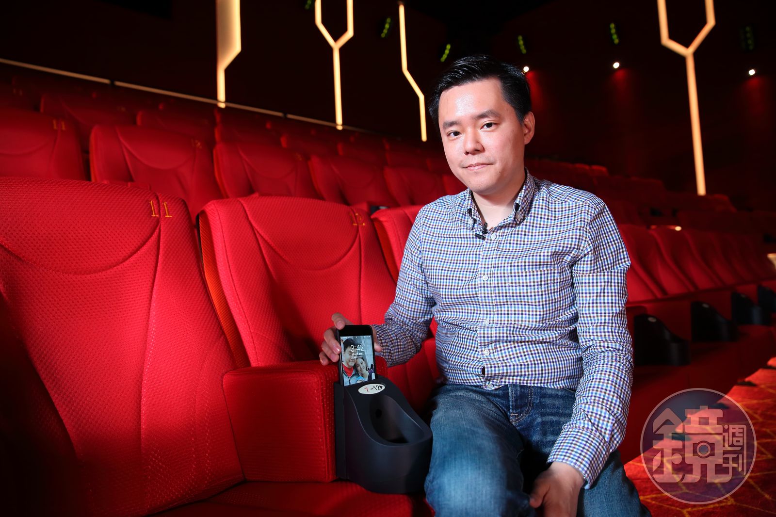 「雙扶手設計,以後不用跟隔壁的人搶扶手放。」就連內裡泡棉分布及護腰位置,他都找來至少50人試坐,要讓8成以上的客人滿意,「這裡還有放手機的空間。」連忙拿起手機示範。接著,他又站起身帶著眾人觀察階梯,「影廳坡度有設計過,就算前排客人身高190公分,後排視線也不會被擋住。」他還開玩笑說:「這樣就不會有糾紛,還要上批踢踢(PTT)。」