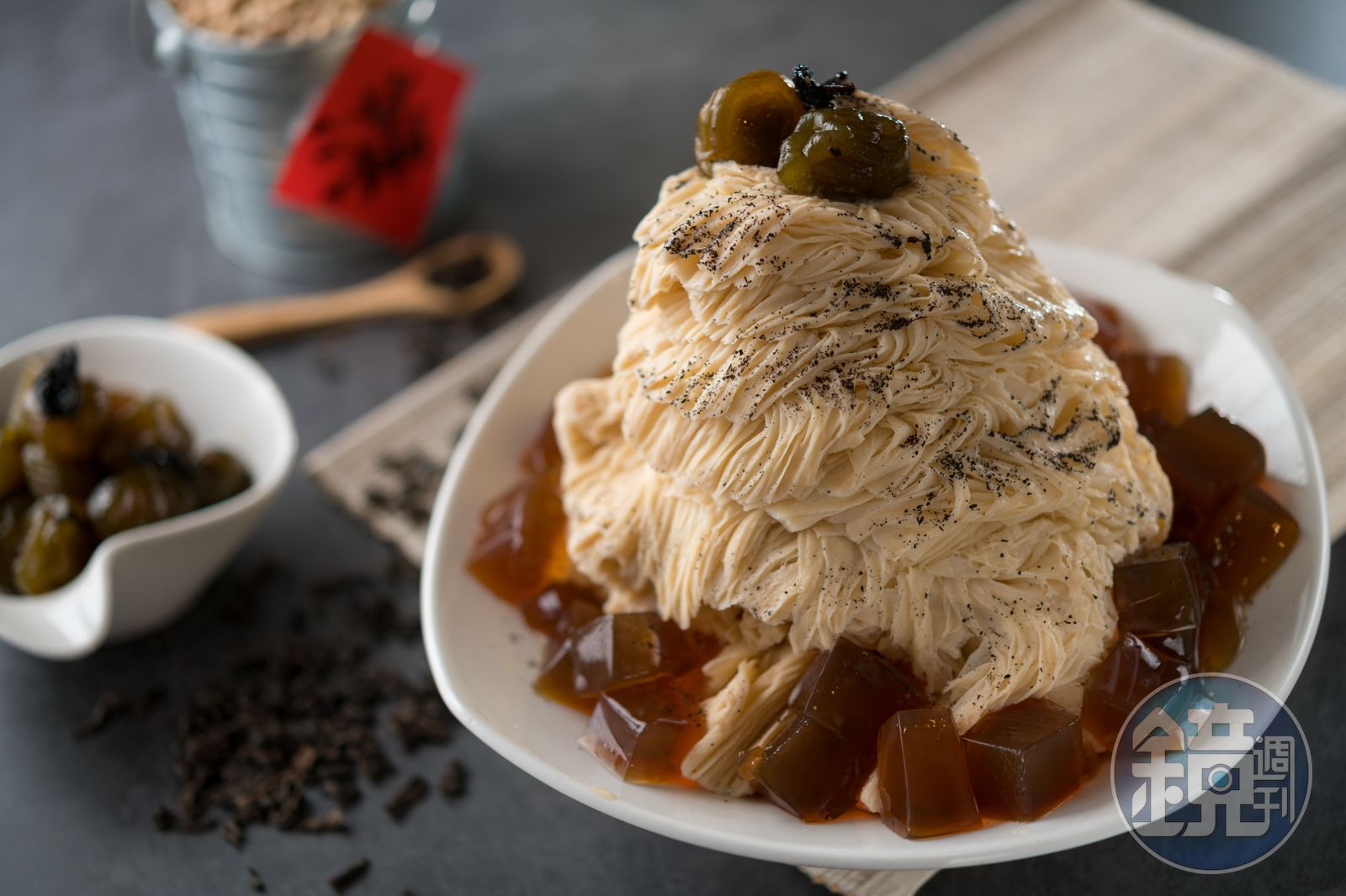 獨家研發的還有「茶梅烏龍雪冰」,冰磚是用南投炭焙烏龍茶製成,刨成雪花,還會撒上烏龍茶葉碎和茶梅粒,吃進嘴裡,茶香在口中縈繞不散。