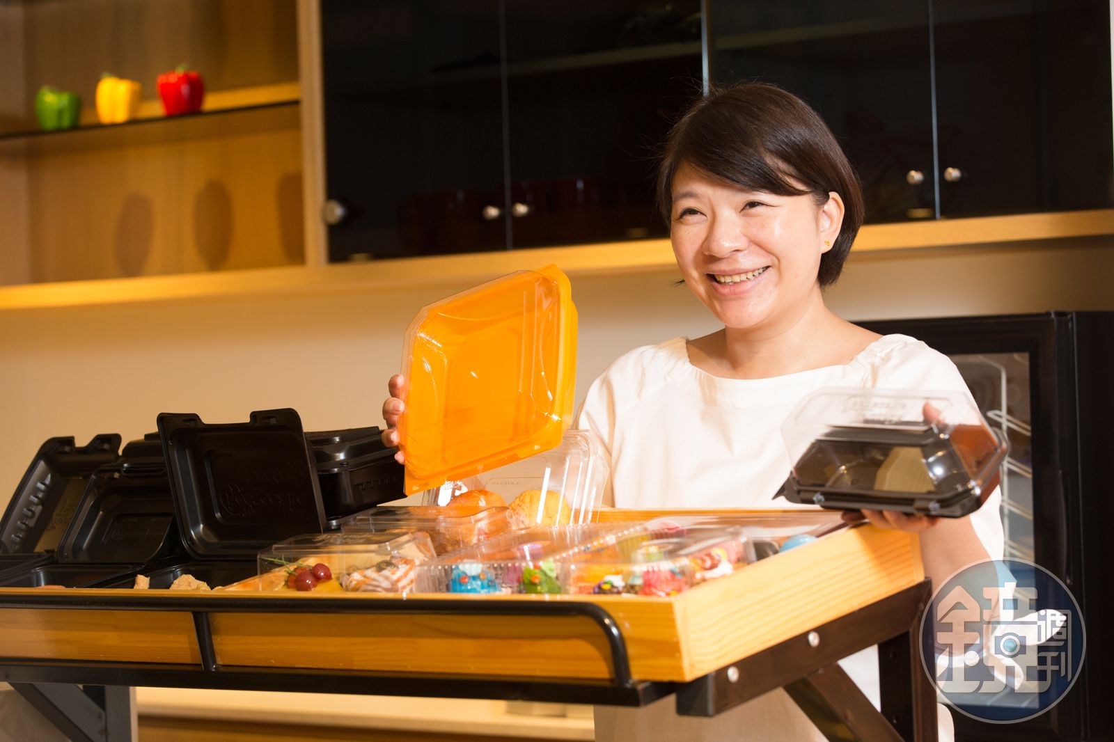 轉入陳郁卉一手打造的展示間,模擬各式盒子擺在生鮮超市、甜點烘焙店的情境,「義美小泡芙裡面的盒子、桂冠火鍋餃及湯圓的包裝盒、快車肉乾的肉紙盒都是我們做的。無論產能、設備,我們都是亞洲最大。」她聲線柔細,卻語帶豪氣,金元福是國內真空成型食品容器龍頭大廠,去年營業額超過42億元,年產品總重量近10萬噸,其中PET材質占8成。