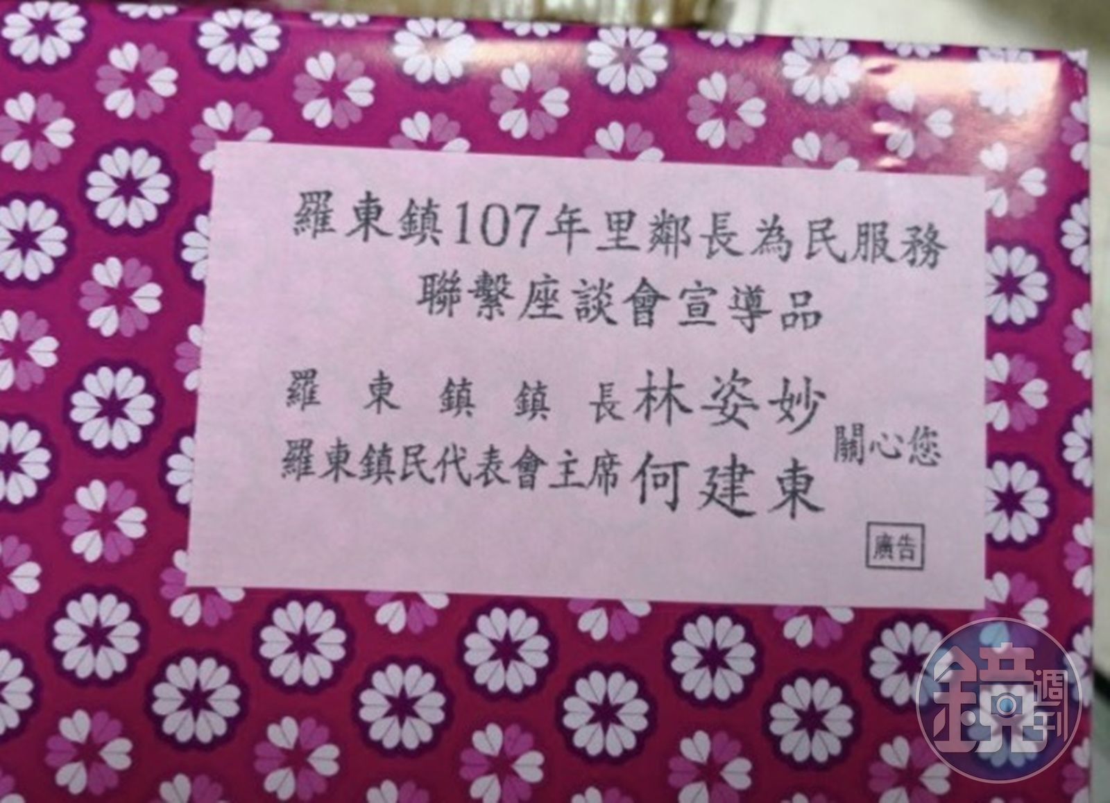 其中,大盒禮品是鵝頭牌元氣單把鍋,網路售價約300多元,遠超過法務部過去查賄標準的30元。且禮品包裝紙外側印有「羅東鎮107年里鄰長為民服務聯繫座談會宣導品」字樣,並署名羅東鎮長林姿妙、羅東鎮民代表會主席何建東。貼紙右下角還標註「廣告」,顯示確實使用公務宣導預算。小盒禮品則裝有麵包等餐點。