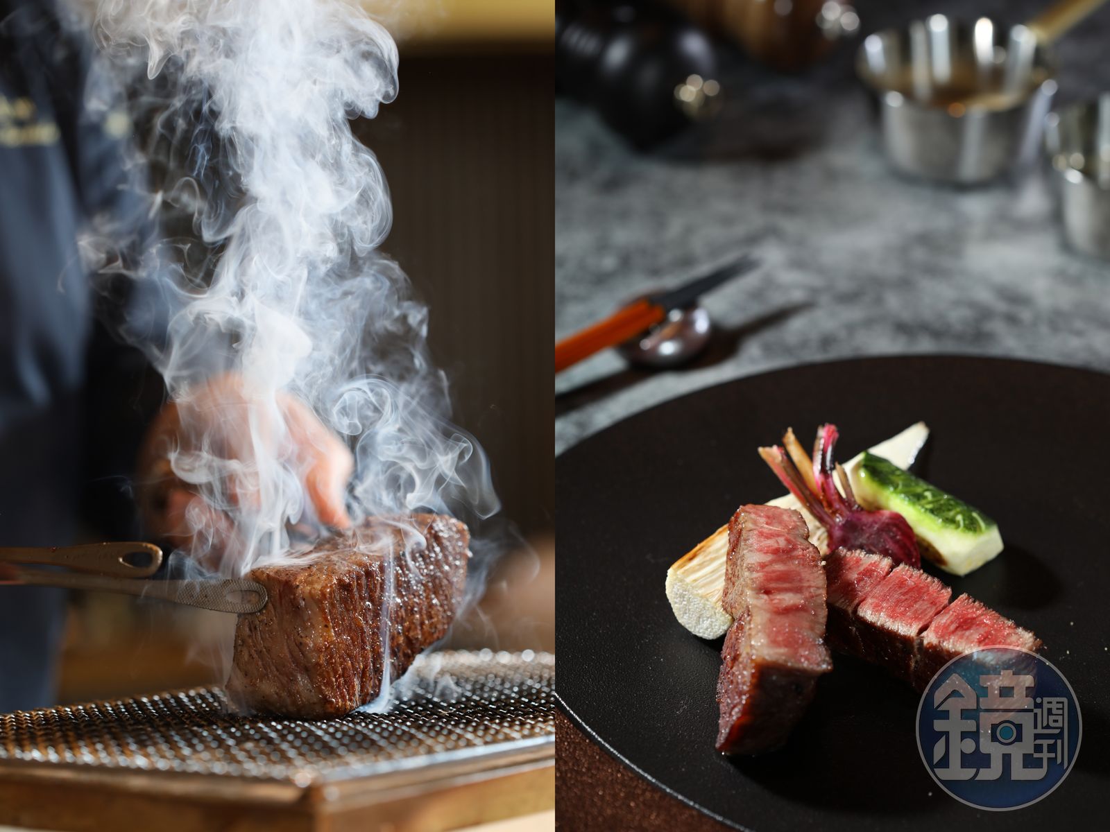 這回台北展店,除了把本家的菜單移植過來,宮澤也為但馬家開發新菜單,「和牛雙重奏」把牛排隔著鐵網接受鐵板熱度,再直接接觸鐵板高溫煎出香氣,讓肉汁全被鎖在細嫩纖維中,卻又有著酥香的外皮,與吉田先低溫加熱再炭烤的手法隔空呼應。唉,兩邊菜單不共通,這下最難的是訂位到底該訂哪邊才好?