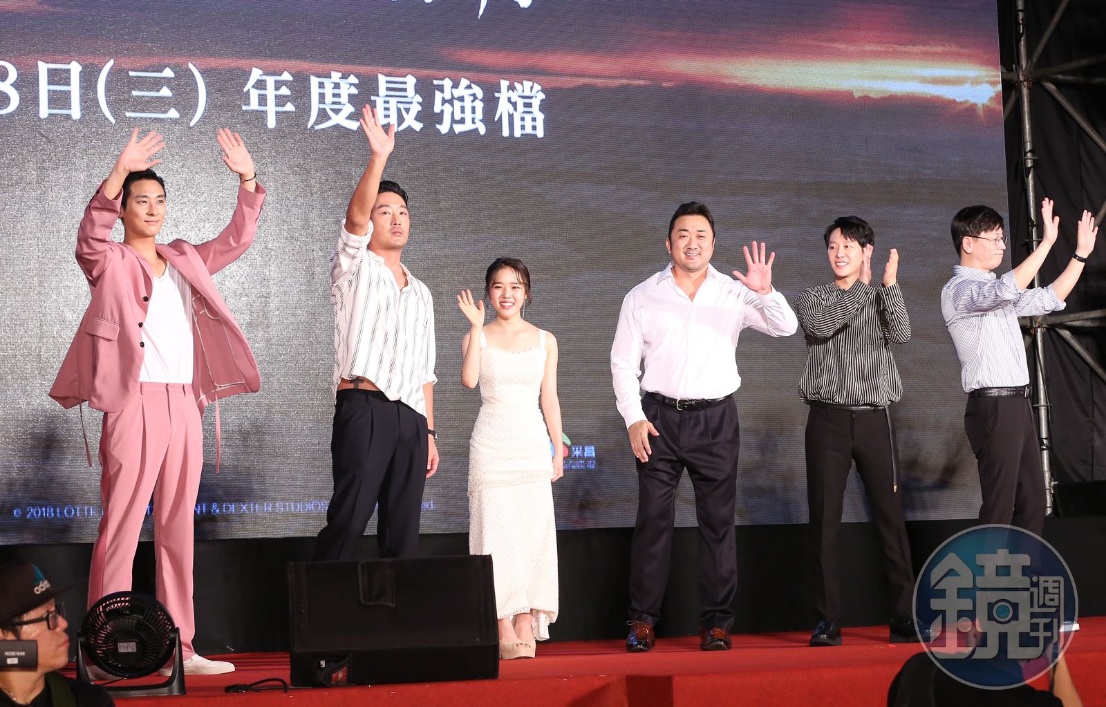 在紅毯環節結束後,導演與演員們在後台稍微整裝,馬東石脫去了西裝外套,以標準白襯衫加黑褲Look與眾人在主舞台正式與台灣粉絲問候,導演金容華代表感謝大家喜愛《與神同行》,河正宇表示這是第一次為作品來台灣宣傳,希望以後還能帶更多好作品來與台灣觀眾見面,表現出對台灣的好感。