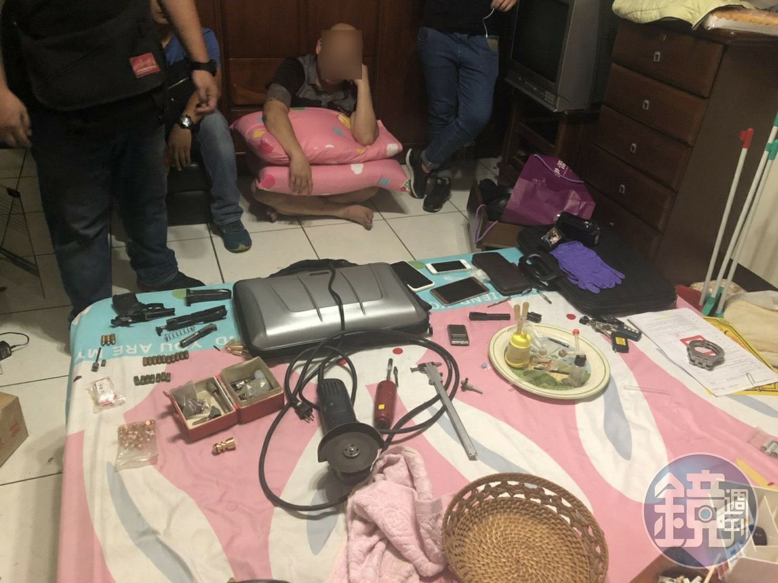 宋姓包租公屋內發現的改造手槍、改造工具鑽頭器等犯罪證物。(警方提供)台北市萬華分局表示,在獲知桃園某大學附近出租套房疑似藏有改造槍枝工廠訊息後,即報請桃園地檢署檢察官進行指揮偵辦。於3日晚間10點至桃園市中壢區中北路進行搜索。