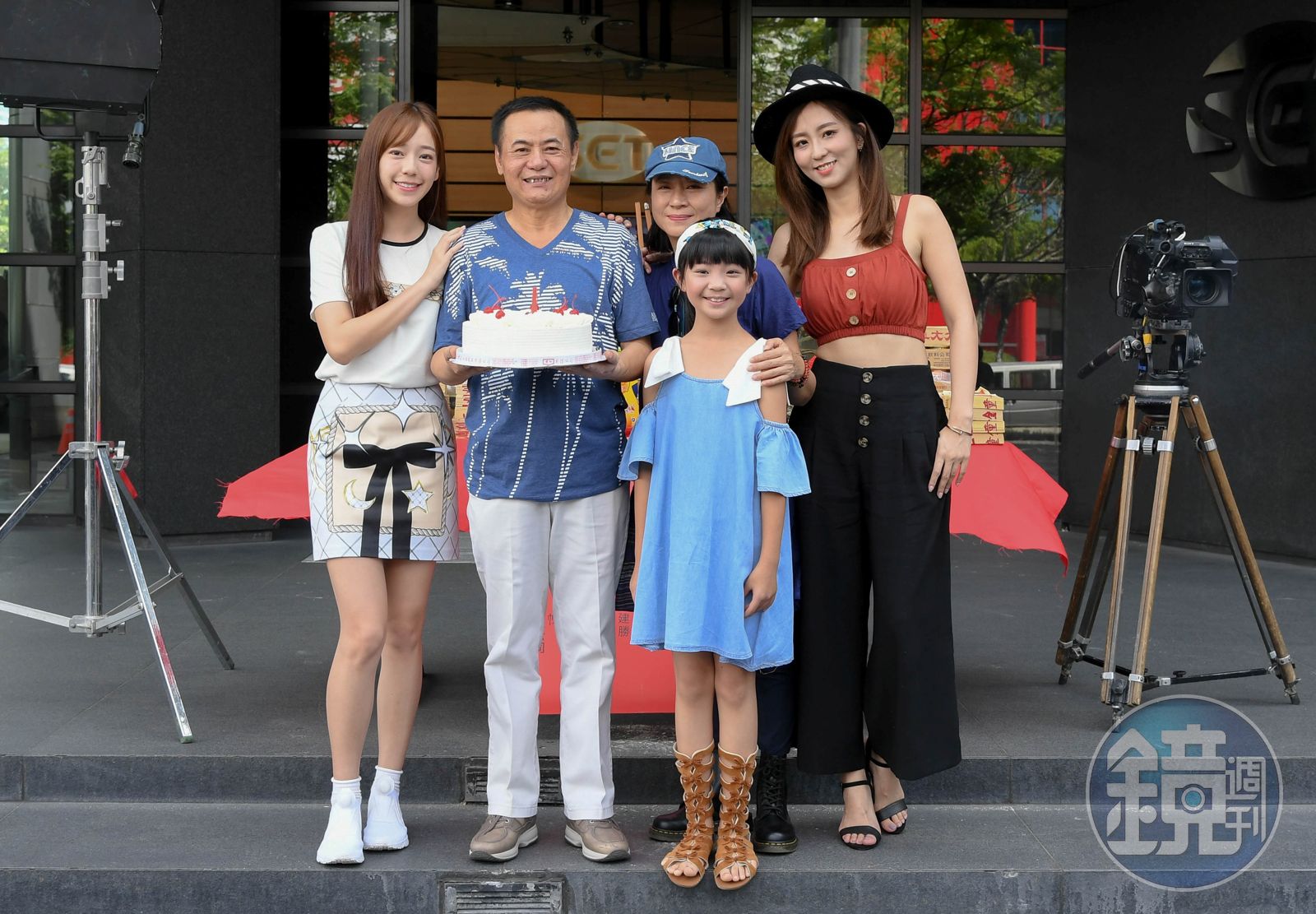 《必勝大丈夫》開鏡儀式,蔡振南和飾演女兒、老婆的演員們合照。(三立提供)開鏡這天,恰好也是女主角周曉涵的生日,劇組特地幫她準備蛋糕慶生,在劇中周曉涵飾演蔡振南的大女兒,蔡振南巧妙譬喻,本來設定戲中有一些家庭爭吵戲,但到最後都變成可愛趣味的鬥嘴。