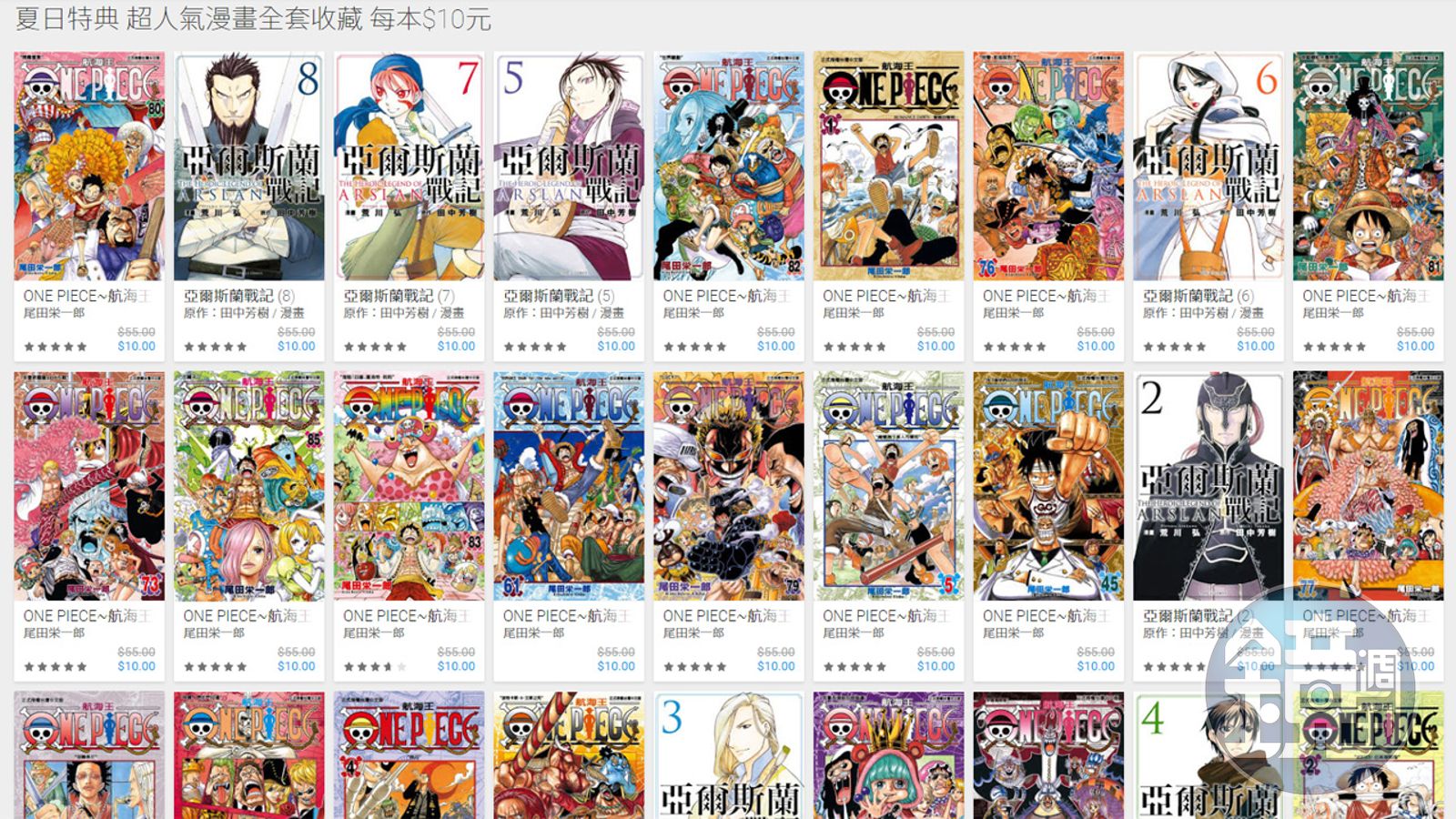 Google Play 圖書裡提供大量的正版電子漫畫,最近舉行夏日特典,每週更換不同的特價項目;本週特價品是尾田栄一郎的經典作品《航海王》,以及田中芳樹原著、鋼鍊作者荒川弘繪圖的作品《亞爾斯蘭戰記》,電子版原價55元,限時特價只要10元!也可以利用預覽功能觀看前20頁,再決定是否購買。 Google Play 圖書限時漫畫特價中,連古早的《航海王》第一集都有,有興趣的朋友可以買來溫故知新。(翻攝自Google Play 圖書)本週特價的《航海王》及《亞爾斯蘭戰記》都是相當熱門的作品。只是兩部作品大部分集數雖然都已在Google Play 圖書販售,但目前最新一集仍未上架,想要收整套電子漫畫的朋友要特別注意。然而一本10元仍是相當經濟實惠,有興趣的讀者請把握機會囉!