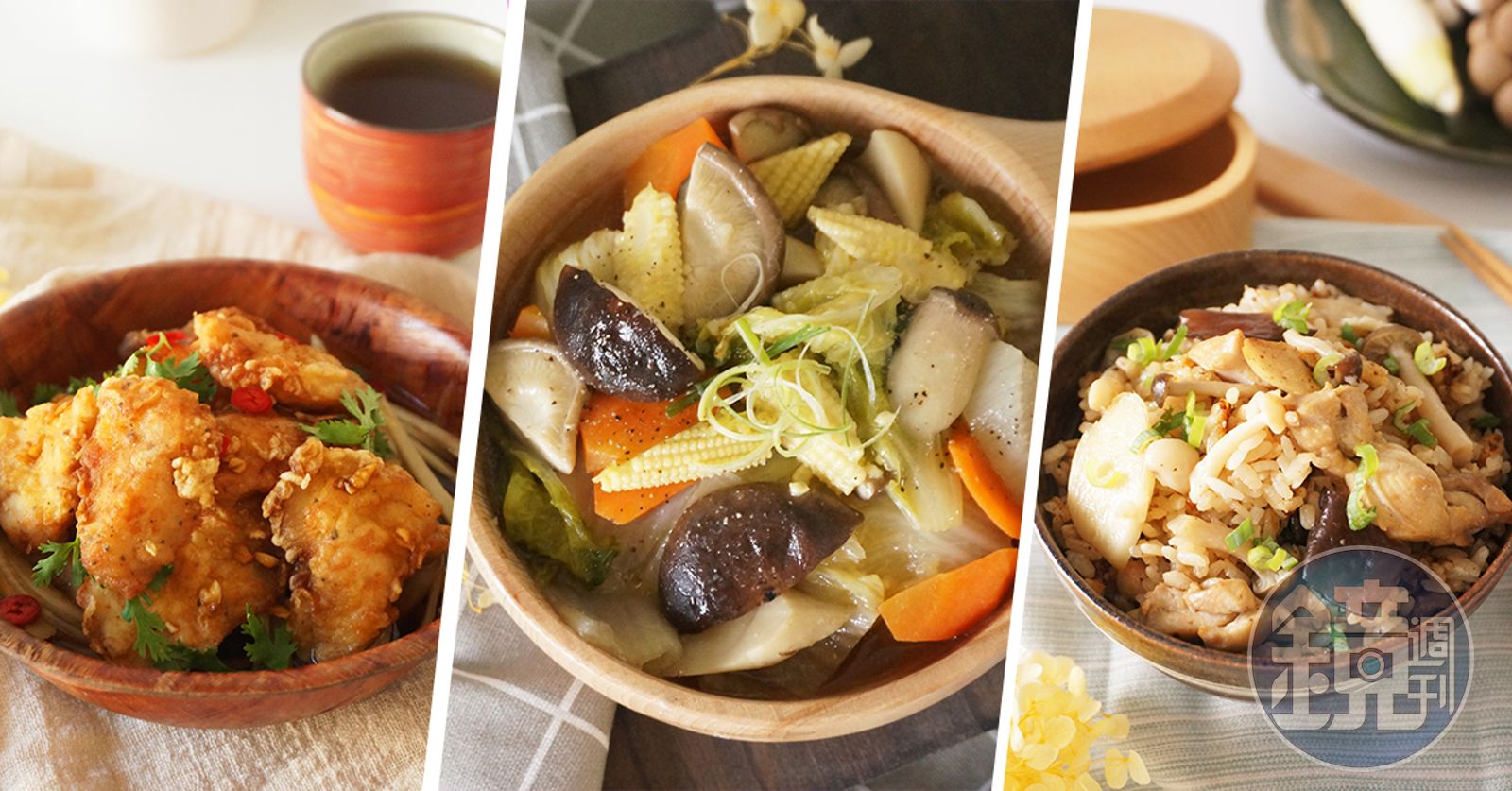 食材:白米2量米杯、去骨雞腿肉200g、鴻禧菇1/2顆、雪白菇1/2顆、筊白筍片60g、木耳50g、柴魚片20g、蒜末1茶匙、胡椒鹽1/2茶匙、泰山均衡369健康調合油適量