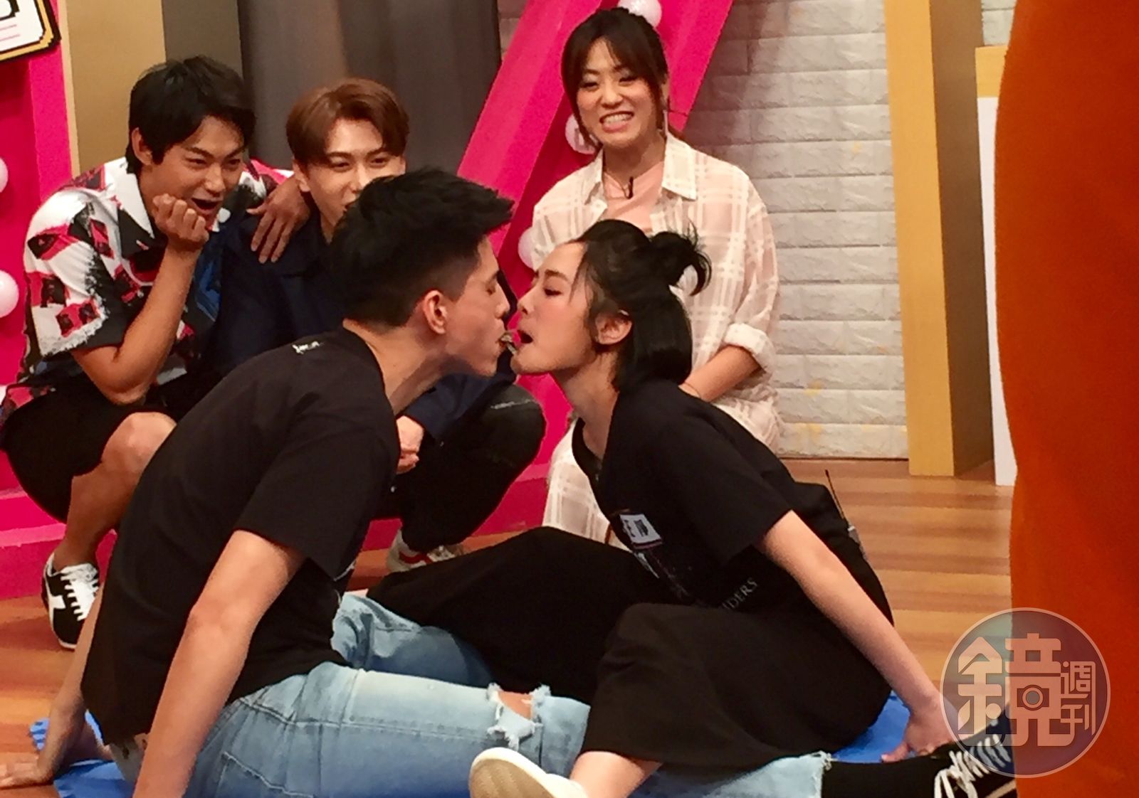 林柏叡和王淨用嘴傳小魚乾,一旁威廉、邱宇辰與海裕芬看得津津有味。(17Media提供)發布時間:2018.08.14 18:48 臺北時間