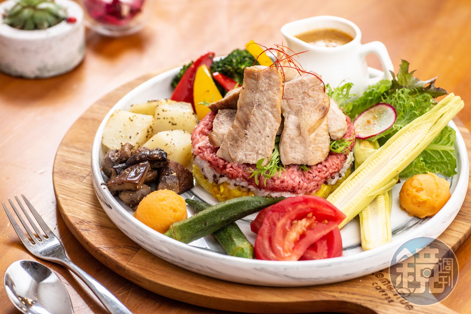 「成真咖啡」從台中起家,陸續在台南、台北展店。咖啡廳空間相當寬敞、明亮舒適。料理都是在開放式廚房內現做。「炙燒椒香雪紋豚彩虹飯」的米飯用紅麴、藜麥、薑黃做出繽紛顏色,豬肉片厚實香甜,配泰式綠咖哩醬吃,微辣下飯。(298元/份)像是「炙燒椒香雪紋豚彩虹飯」,米飯就用紅麴、藜麥、薑黃做出繽紛顏色,上頭的豬肉片取自僧帽肉,口感厚實、軟嫩香甜,一旁還圍繞近10種蔬菜,配著泰式綠咖哩醬一起吃,辛香微辣、十分下飯。