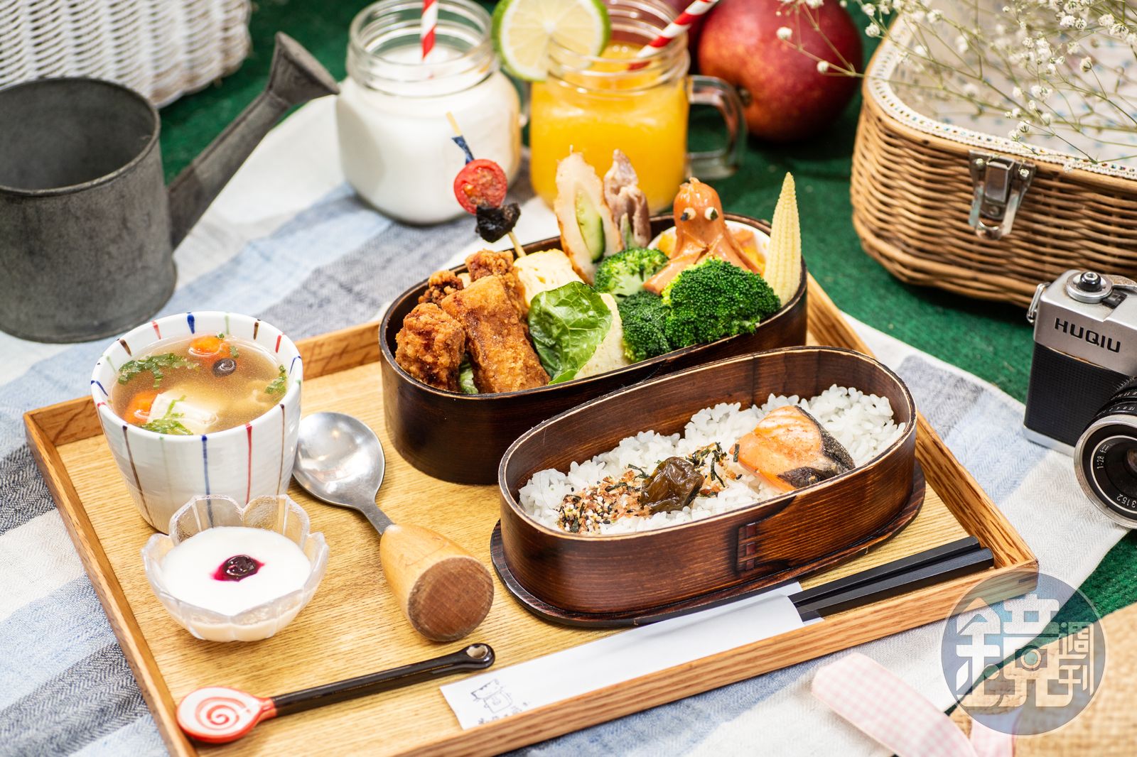 生了兩個寶貝女兒後,店裡又多了親子元素,除了有讓小朋友玩扮家家酒的迷你食堂,餐點也從輕食改成日本鄉村料理,把媽媽悉心為家人做便當的意念,細緻呈現。像是用木盒盛裝的「炸鮮魚便當」,不僅有鹹酥甜嫩的炸鯛魚塊,還有章魚香腸、玉子燒、蔥肉捲、鹽烤鮭魚等手作配菜,滋味細膩,吃得出用心。