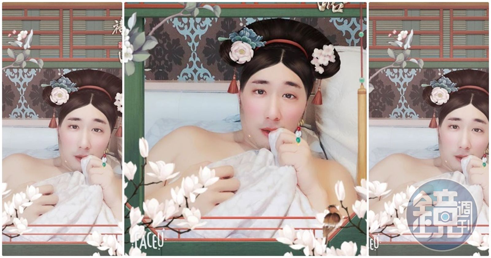 余祥銓臉書有八千多名粉絲追蹤,愛好和粉絲分享生活點滴的他,經常發揮諧星本色,毫不遮掩自己醜態扮相,只為博粉絲一笑。昨晚他用《延禧宮略》特效相機,PO出「羞咬被被」的裸妃圖,雙頰粉嫩蘋果肌,眼神還故意迷濛嬌羞,說道:「皇上~今晚是否翻拳妃的牌呢」。