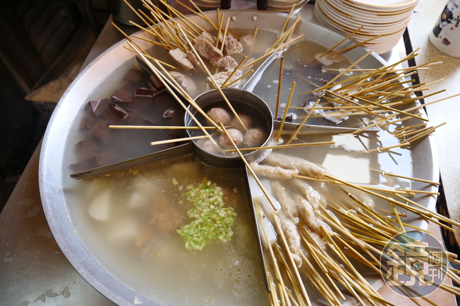 大鍋裡一串串的黑輪、米血、油豆腐、蘿蔔,甚至還有豬肺、氣管等內臟,沖洗得乾淨無腥臊,Q軟脆口「光是為了洗豬肺,2個月就花6千多的水費。」老闆娘笑說。