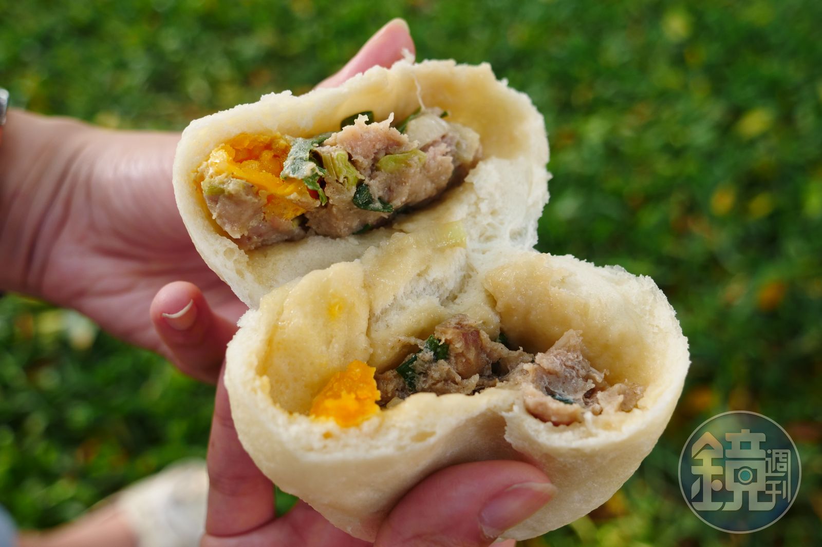 下午3點半一到,這間位於台南三官路上的包子店店頭早已排滿機車,等的就是這疊成塔般的蒸籠出爐。「有些肉包冷掉以後,會濕到整個皮底下糊糊爛爛的,他們家不會,麵皮是手工撖的,即使冷了還是很有彈性。」林敬堯說,加了蔥與香菇的肉餡鮮美,配上份量與熟度剛好的鹹蛋黃,沒有多餘的調味。