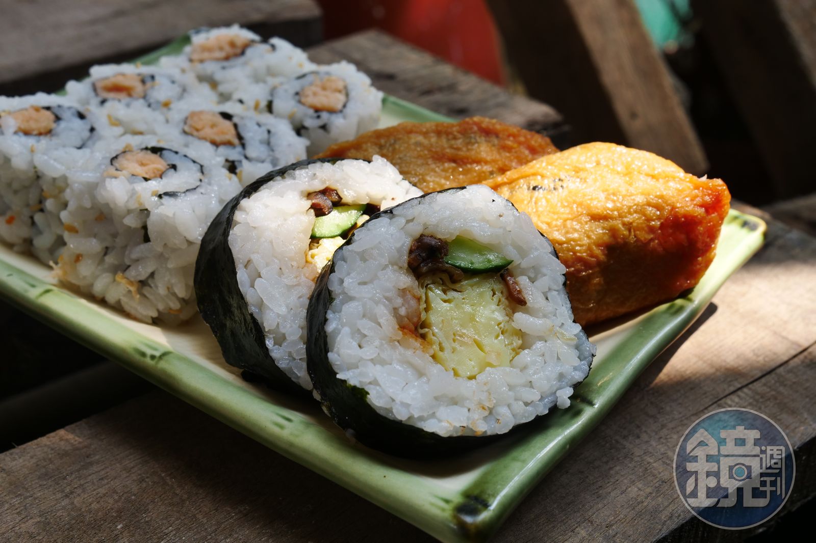 壽司卷裡的料十分簡單,但是卻很講究。台梗9號的米煮得剔透分明,我最喜歡迷你鮭魚卷,魚肉是自家炒,濕潤又有鹹香;而太卷壽司和花壽司中的高湯蛋捲滑嫩多汁。稻荷壽司的醋飯則是先滾上黑白芝麻添香,再包入豆皮裡,有趣的是,一般都是芝麻向外頭,它則是貼近豆皮,減低了甜膩。而模壓壽司的用料實在,蝦肉緊實鮮甜,包著海苔像是米飯三明治。