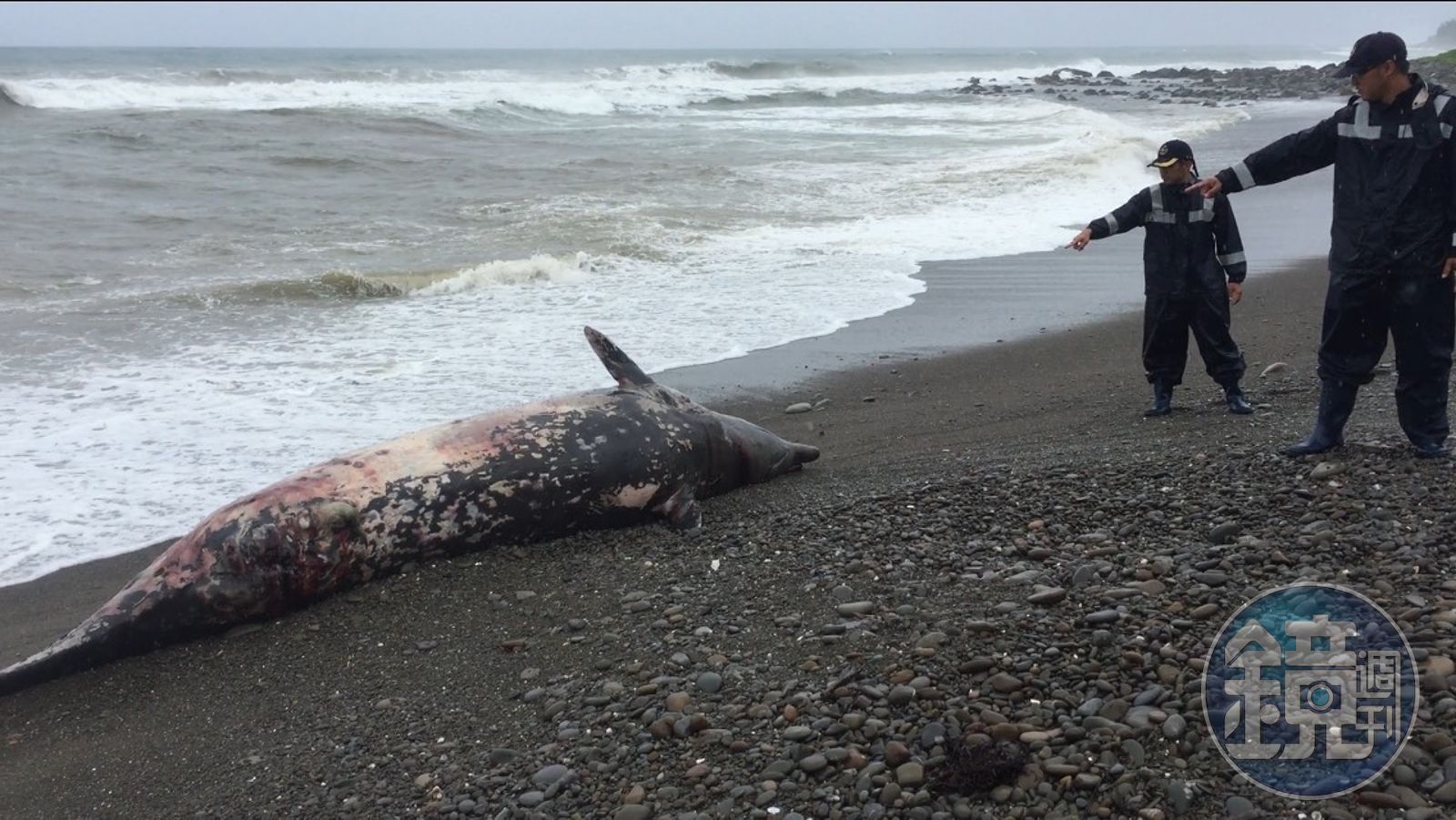 海巡隘員在車城附近海岸發現柯維氏喙鯨陳屍。(翻攝畫面)發布時間:2018.08.23 14:34 臺北時間