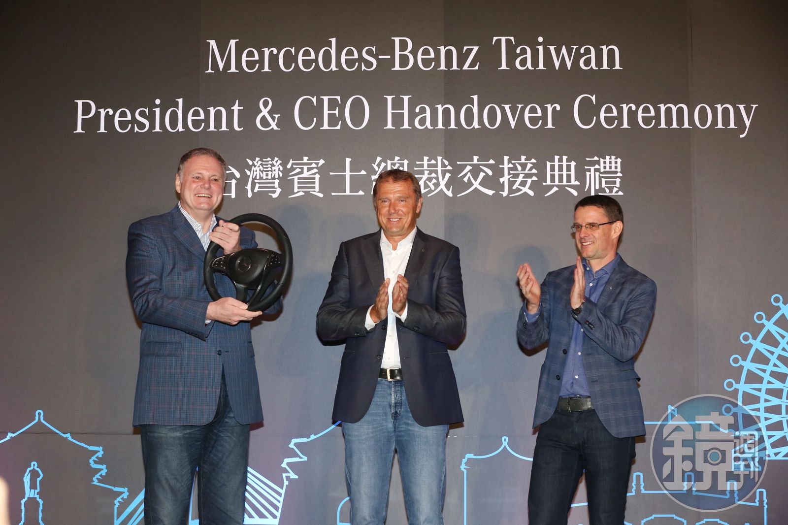 隨著在台銷量屢創新高,這次交接典禮,德國原廠戴姆勒集團也派出全球賓士轎車業務暨產品管理副總裁Axel Harries來台見證,並由邁爾肯將象徵傳承掌舵的賓士方向盤交付給新任總裁高明漢(Michael Grewe)。「未來賓士將繼續投入更多資源支持台灣市場,持續導入更多產品。」