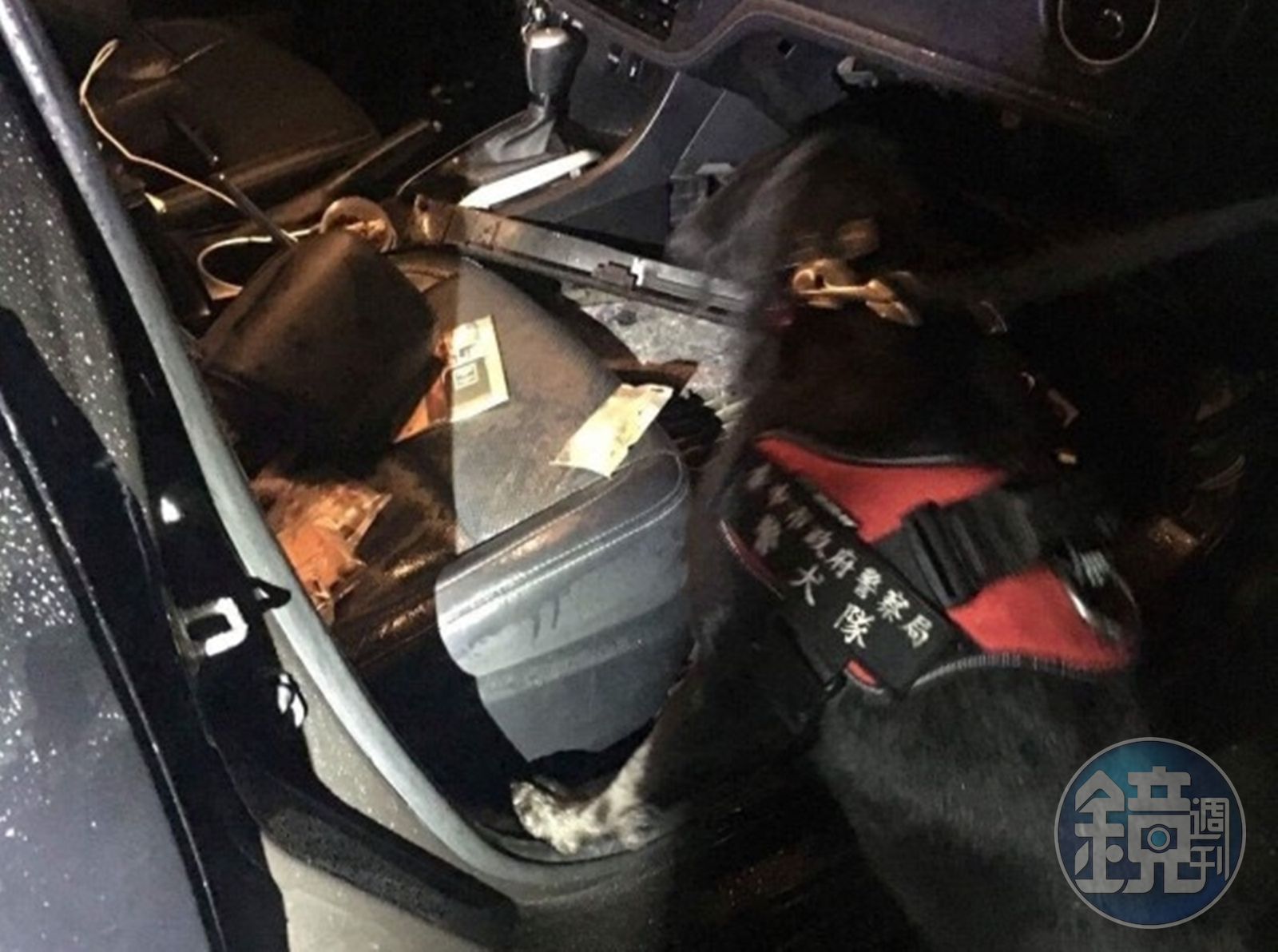 領犬員帶著Candy、Tiny 2隻緝毒犬趕抵現場,2犬發揮靈敏嗅覺,在車內外一陣嗅聞,後不到3分鐘即定格,警方根據緝毒犬鼻子指定位置,仔細拆解,順利在副駕駛座前置物箱的內側夾層裡,起出K他命32包(135.5公克)、含「合成卡西酮類」成分的美人魚毒咖啡包14包(62公克)、梅錠1罐(16公克)。