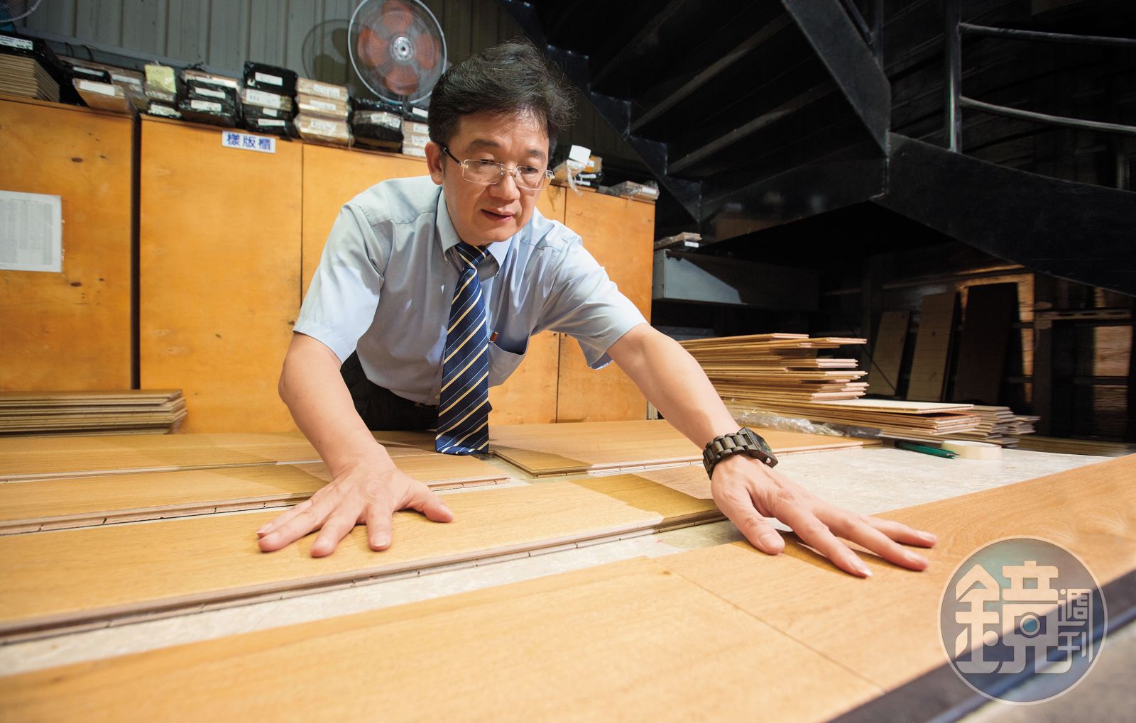 但921地震卻將他震落,「當時我們的生意8成來自新建案,1999年台中市的329檔期,推案量高達1,120多億元,隔年只剩20幾億元。」沒建案便沒得鋪木地板,他與朱立勳決議拆夥但繼續合作,由他整合國內加工廠製造並外銷,產品也供給朱立勳做內銷。