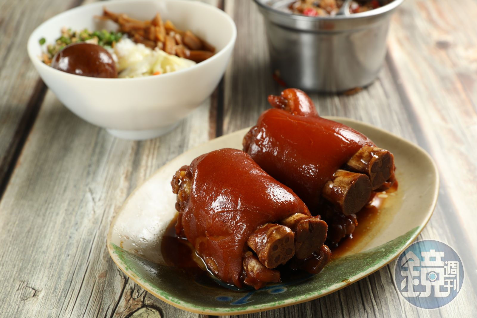 店裡的品項有中段、蹄膀、腳尖可選,蹄膀還能選偏肥、偏瘦,或肥瘦各半,滋味各有千秋,最深得我心的是「ㄉㄨㄞ ㄉㄨㄞ」的中段,油亮紅潤,一咬就掉,但一進到嘴裡,Q彈的皮讓人驚豔,肥而不膩,啃到連骨邊筋肉都完食,就像吃一塊蛋糕般容易,老闆打包票說:「常常客人吃到只剩骨頭,還把骨頭吸到白閃閃。」