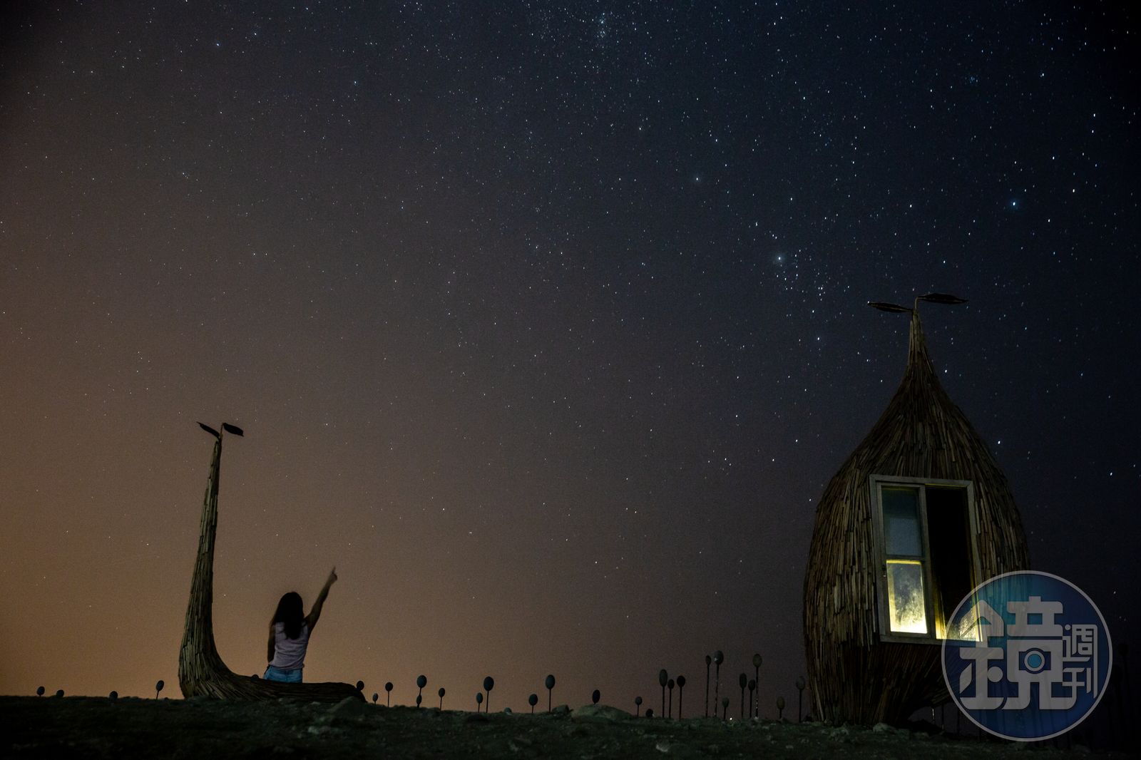 伊祐.噶照創作的一系列海邊看書主題,看在天文學家眼裡,椅子造型有如鯨魚座,書屋好似寶瓶座,「柏修斯就是把這隻鯨魚打敗了,贏得衣索比亞公主的青睞。」李昫岱緩緩說,這一刻隱約聽見星星的呢喃,夜空的戲碼可精彩了。