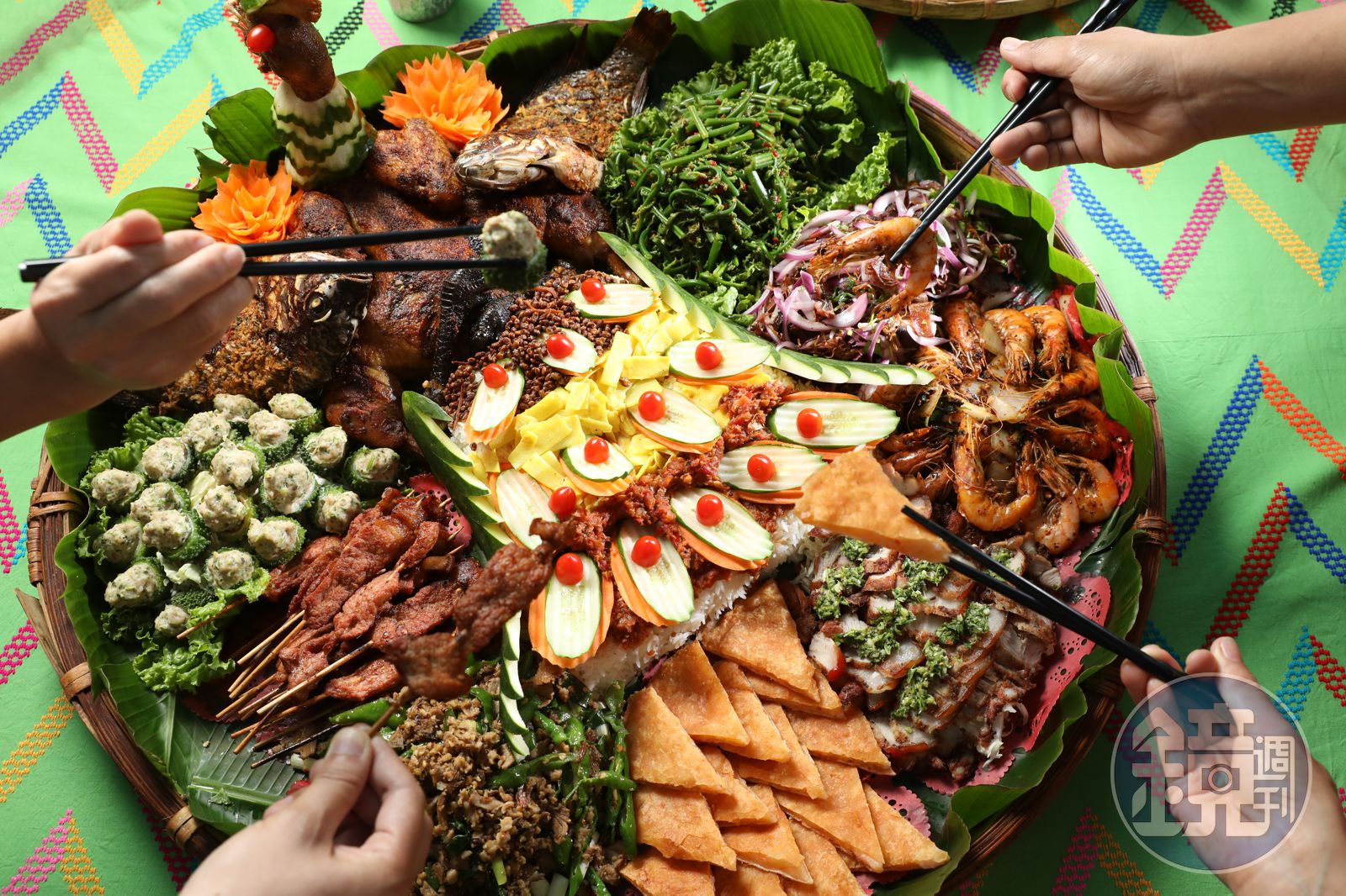 本是景頗族用以宴請貴客的這道料理,果真霸氣十足,十菜一飯裝在鋪有芭蕉葉的大竹篩裡上桌,整隻烤雞是孔雀頭,兩隻烤魚成了翅膀,蕨菜、山苦瓜丸、麻辣蝦、烤肉串、拌野菌等配菜,和鋪了傣族筍乾和納豆乾的米飯則碼成了色彩斑斕的尾羽,好一幅孔雀開屏圖。