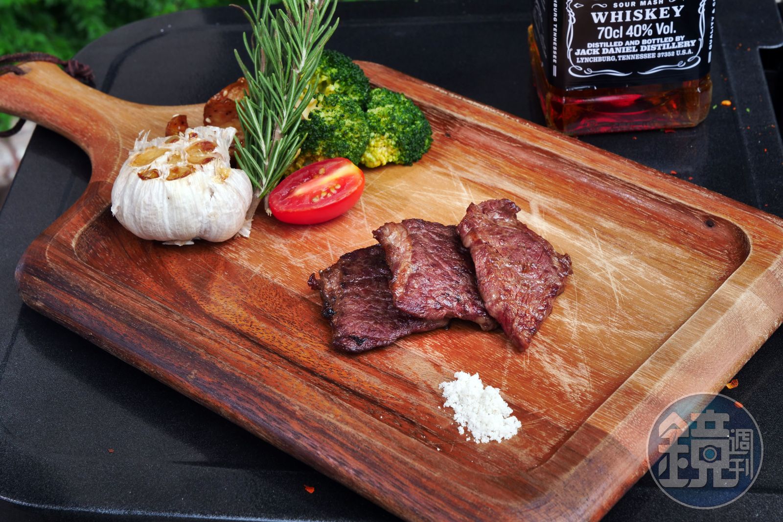 「美國牛肩小排取自肩胛部位,口感近似牛小排,但較無油膩感,很適合炭烤,原味的油花肉香就很迷人。」謝金龍指出,在燒烤過程,油花滋滋作響,油香漫溢,約莫烤到6分熟,噴灑田納西威士忌,芳馥的酒香瞬間滲入肌理,美牛和美威有如天生情人,激迸出誘人風味。