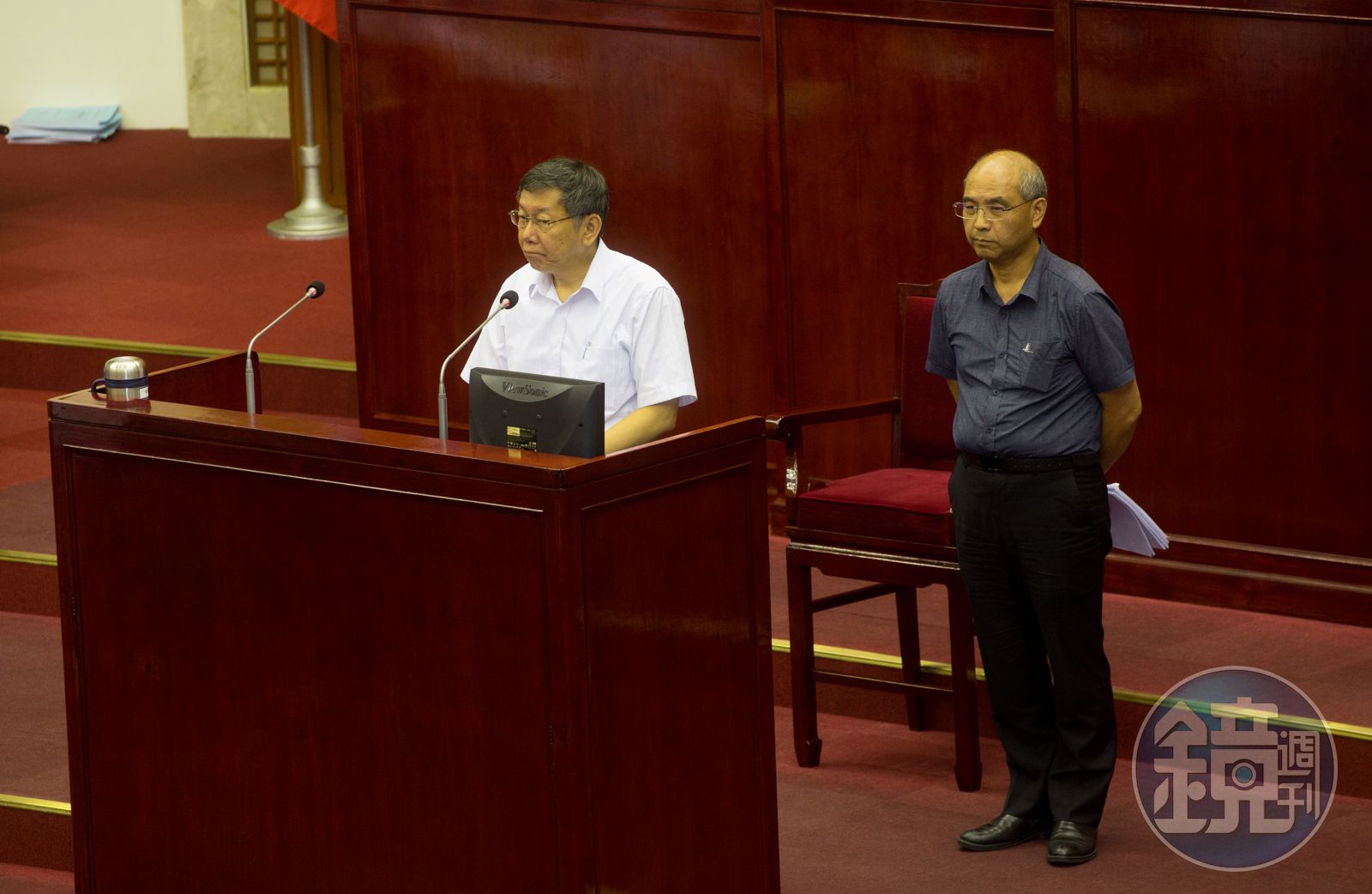 在議員洪健益不斷追問、要求道歉下,柯文哲說:「她有事情就進來處理,不要把內部問題外部化,我為什麼要跟她道歉?她不來議會備詢,連議長都說話了,我們還去拜託農委會,她還是不來,我操…結果,還是我站在這裡被罵。」