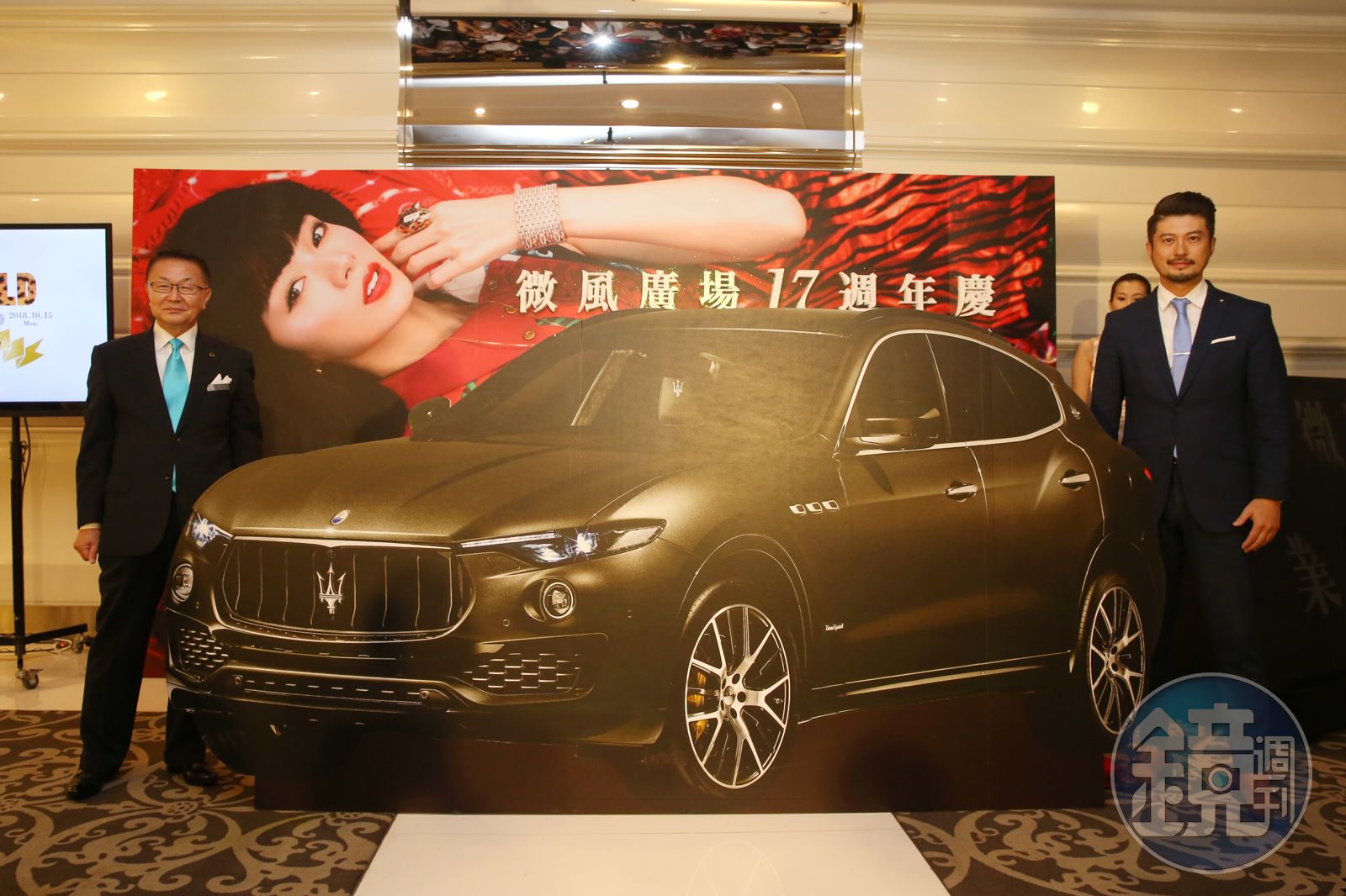 微風集團一級主管與車商代表站在台上,一同拉開紅色布幕,裡面有價值458萬元的MASERATI Levante Forza汽車,這是微風歷年週年慶以來最貴重的抽獎禮。