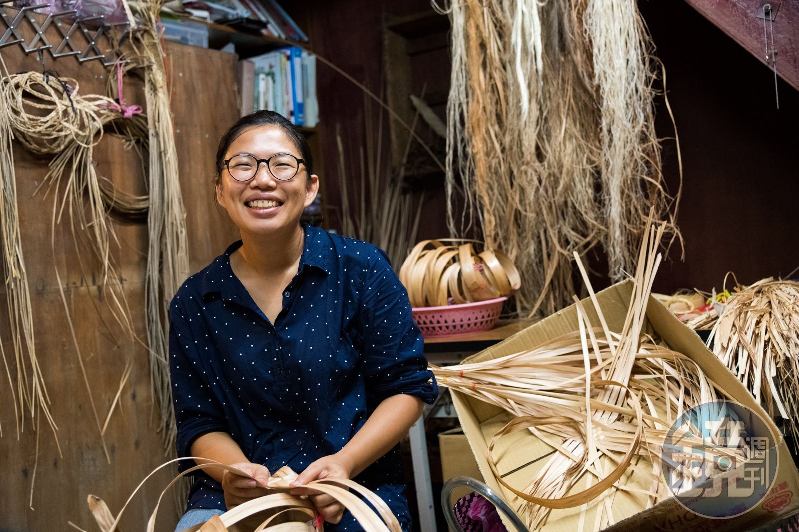 走進店裡,老屋一角掛著從天花板垂吊曬乾的月桃素材,有的成條狀、有的是圓圈狀,黃芳琪進一步解釋,其實很多人都誤以為,月桃編織取用的是月桃葉,其實不然,編織使用的部位其實是葉子與莖連結的葉鞘,把新鮮月桃砍下來連同葉子一起日曬,曬乾後只取用葉鞘,接下來還得把葉鞘捲成圈狀、再拉成長條…,光是處理素材就得經過好幾道工序。