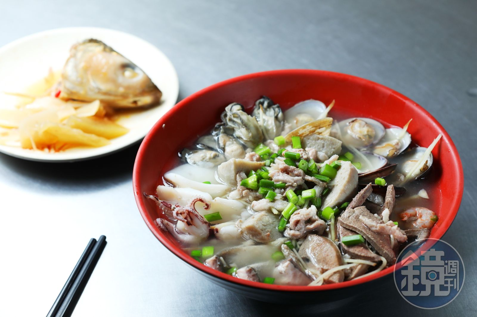 小老闆黃琦瀚一看到我們走進,連忙招呼點餐,相當熱情,他從冷藏櫃裡拿出小碟,上頭擺滿虱目魚肚、小卷、鮮蝦、蚵仔、文蛤、豬肝、肉絲等7種好料,俐落地抓起快煮鍋,倒入白飯與虱目魚骨熬煮的高湯一起下鍋,沒幾分鐘,店內最受歡迎的「海產粥」就上桌了,隔壁桌客人吃飽還對著我心滿意足說,他就是愛這一味。