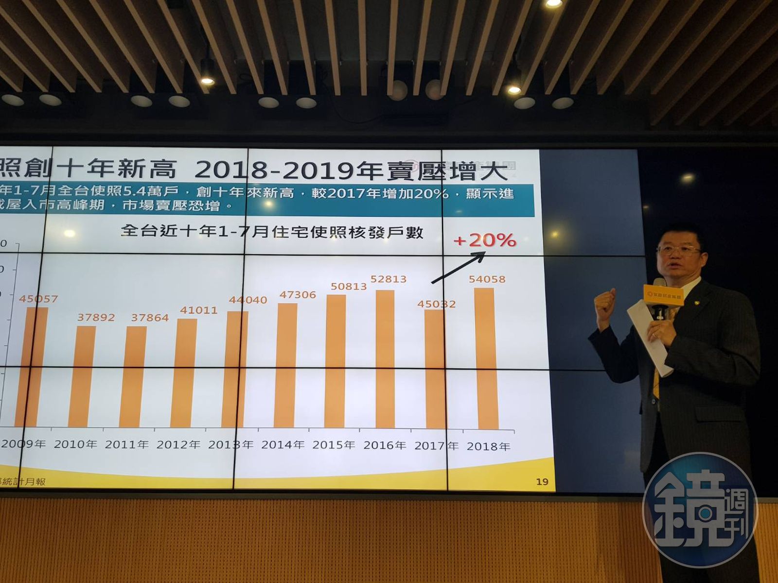 葉凌棋說明,2018年1到7月全台使照5.4萬戶,創10年新高,顯示進入新成屋入市高峰期,另根據內政部2017年Q4統計,全台待售餘屋量高達7.45萬戶,市場仍有大量新建待售餘屋待去化,新成屋入市加上大量待售餘屋充斥,預期2018到2019年市場賣壓沉重。
