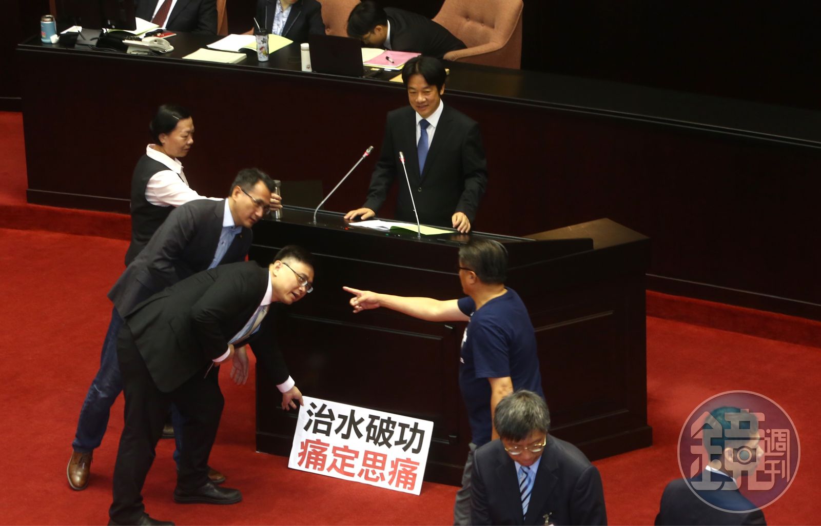 賴清德上週五遭杯葛無法上台報告,但因為今天的「823中南部水災之治水機制」專案報告是由國民黨團提出,因此國民黨團並未甲動杯葛,只在開場時舉「治水破功、痛定思痛、X話連篇」等標語喊口號抗議,但並未阻止賴上台報告。