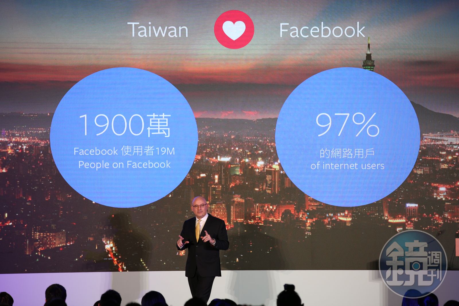 臉書統計指出,台灣2,300萬人口,臉書用戶達1,900萬,等於台灣有97%人都有使用臉書,滲透率居亞太之冠。臉書去年在台舉辦首屆「Made by Taiwan」品牌推廣計畫,除了讓捷安特等國際大品牌,藉由Ride Like King十週年活動,成功串起全球車手情感外,也讓超夯手工蛋捲海邊走走、寵物相關周邊商品迪貝多等中小型商家走出國際,打響成功跨境行銷的案例。