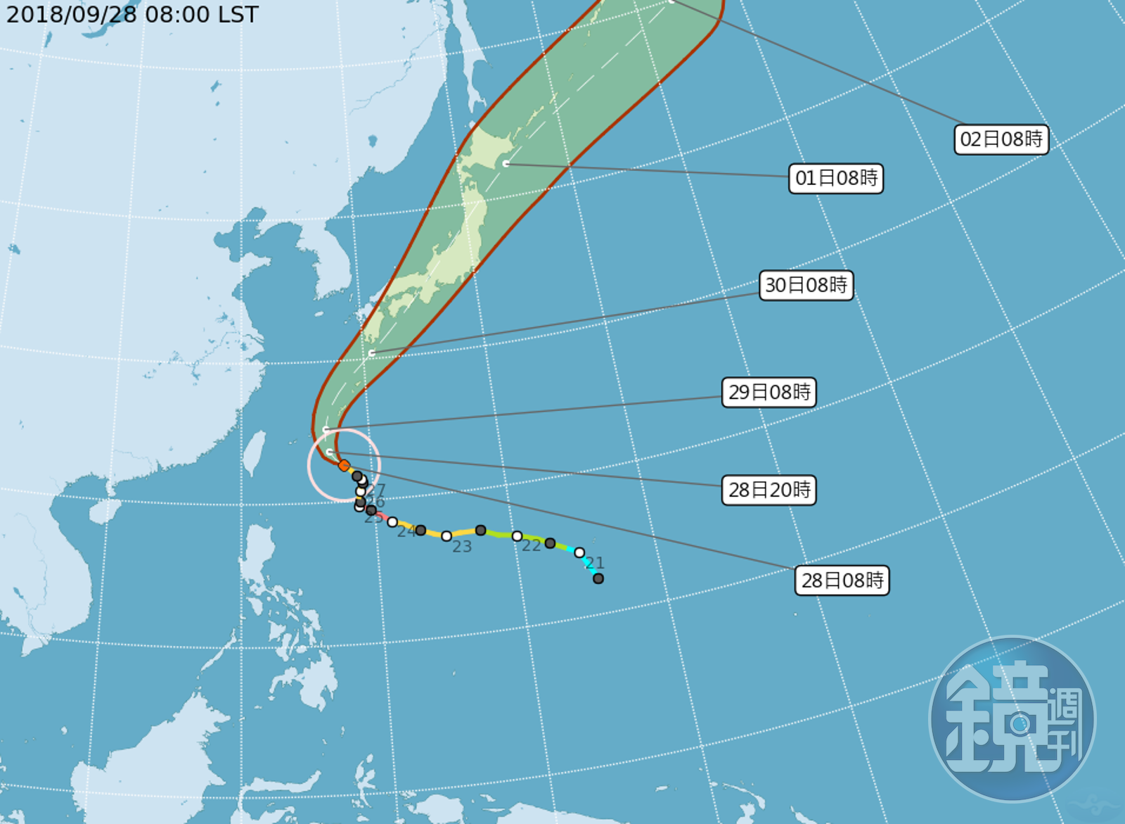 氣象主播賴忠瑋表示,潭美颱風移動方向已經開始轉朝西北,今天深夜到明天凌晨才會逐漸轉向朝東北,往沖繩西方海面移動,明天下午逐漸受到北方槽線牽引,而加速往日本方向前進,預計週日到週一影響日本。