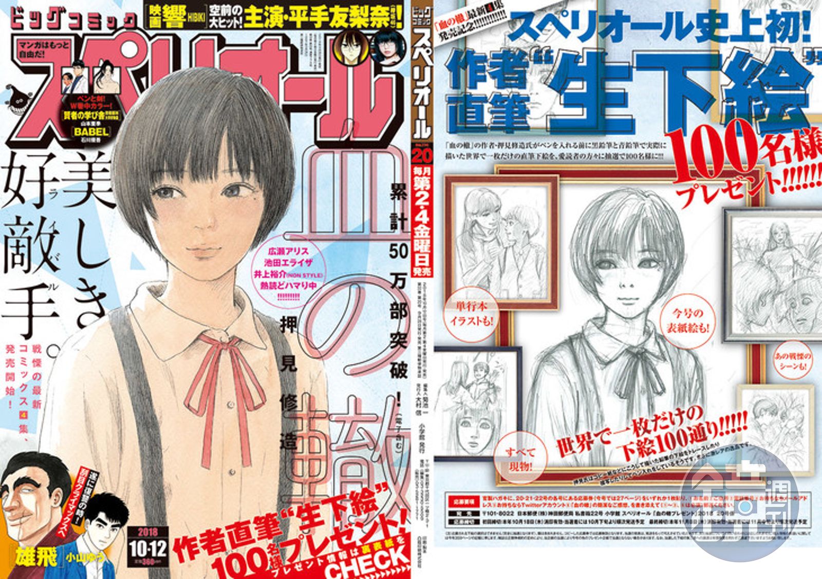 《惡之華》作者押見修造去年 6 月開始,在漫畫雜誌《Big Comic Superior》連載的最新作品《血之轍》(血の轍),被譽為是沉默與絕叫、描寫人性扭曲面的再一大作,連載開始 3 個月即推出單行本,前 3 集累積銷量突破 50 萬冊,而最新的第 4 集於 9 月底(28)上架,為慶祝第 4 集發售,同日發售的《Big Comic Superior》20 期舉辦了雜誌史上第一次的「生下繪」(作者的親筆簽名繪畫)抽獎。