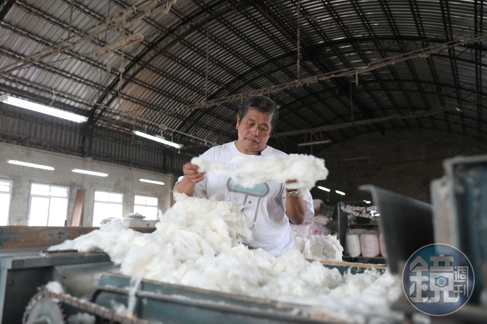 走進廠房裡,天花板掛滿棉絮,這可是老製棉被廠才有的景象,因為化學纖維被空氣吹起只會下沉,無法往上飛舞。廠內四張方形的檜木桌,都有30年以上的歷史。蔡順龍將棉花擺進梳棉機裡,一團團棉花就自動被梳理成一綑棉毯。