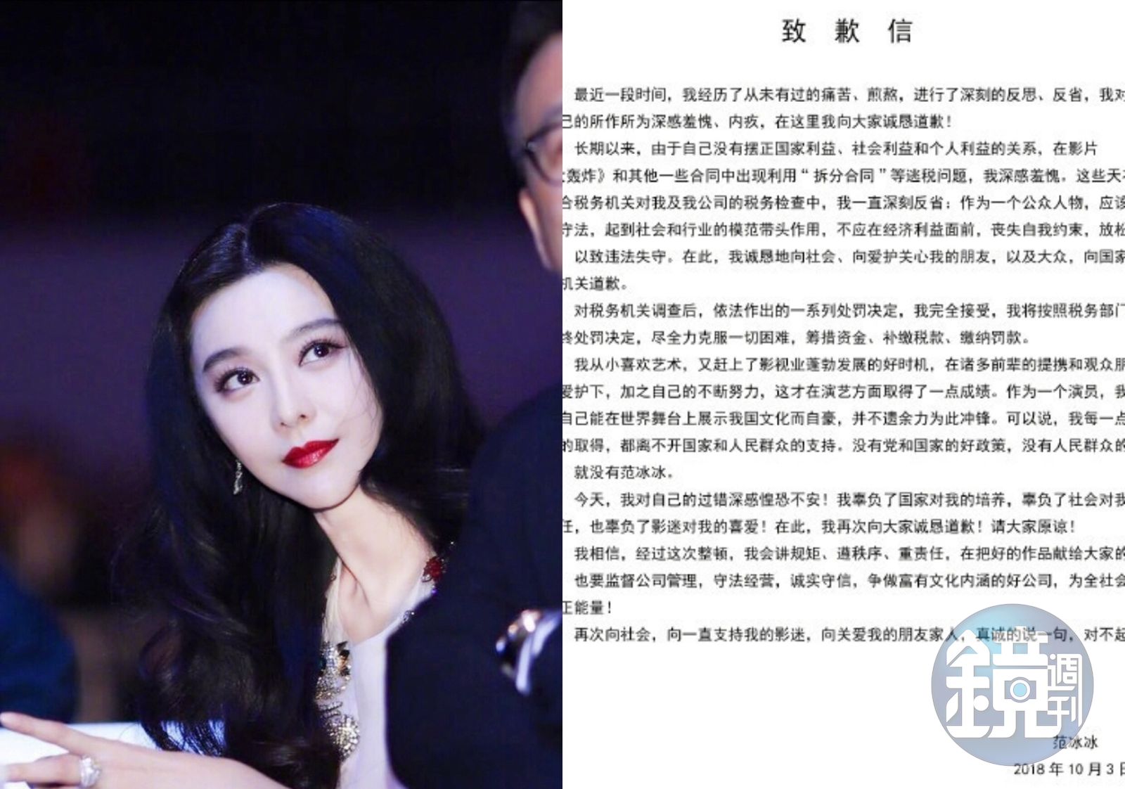 經大陸稅務機關公布調查結果,要求她補足台幣40億元的稅金與罰鍰,范冰冰也po出道歉文。(翻攝自范冰冰微博)范冰冰除了承認違法,辜負國家培養、社會信任、影迷喜愛,她重申自己對演藝事業的重視,強調以後會守規矩、遵秩序、重責任,把好的作品獻給大家,「也要監督公司管理、守法經營」,並在文末向關心她的影迷、家人朋友道歉。
