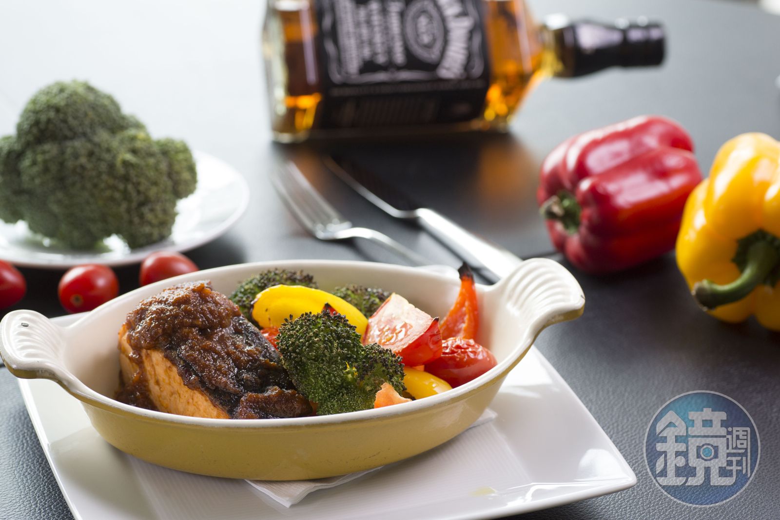 他為我們示範的「烤紐西蘭國王鮭佐威士忌BBQ醬汁」,先以田納西經典風味威士忌醃漬鮭魚,使酒香滲入肉質,再將同款威士忌調入蘋果、蜂蜜煮成的醬汁裡,威士忌的作用內外加持,讓鮭魚吃起來不單只有油潤腴香,更表現出細緻豐富的甜味。