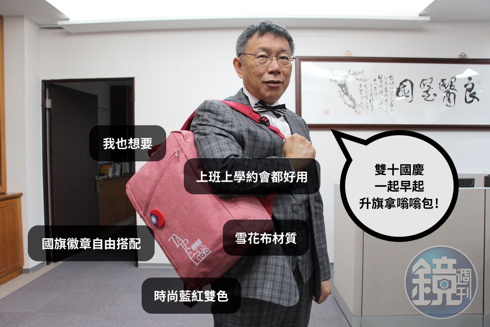 台北市長柯文哲當起北市雙十國慶紀念品嗡嗡包的宣傳模特。(翻攝柯文哲粉絲專頁)發布時間:2018.10.09 15:06 臺北時間
