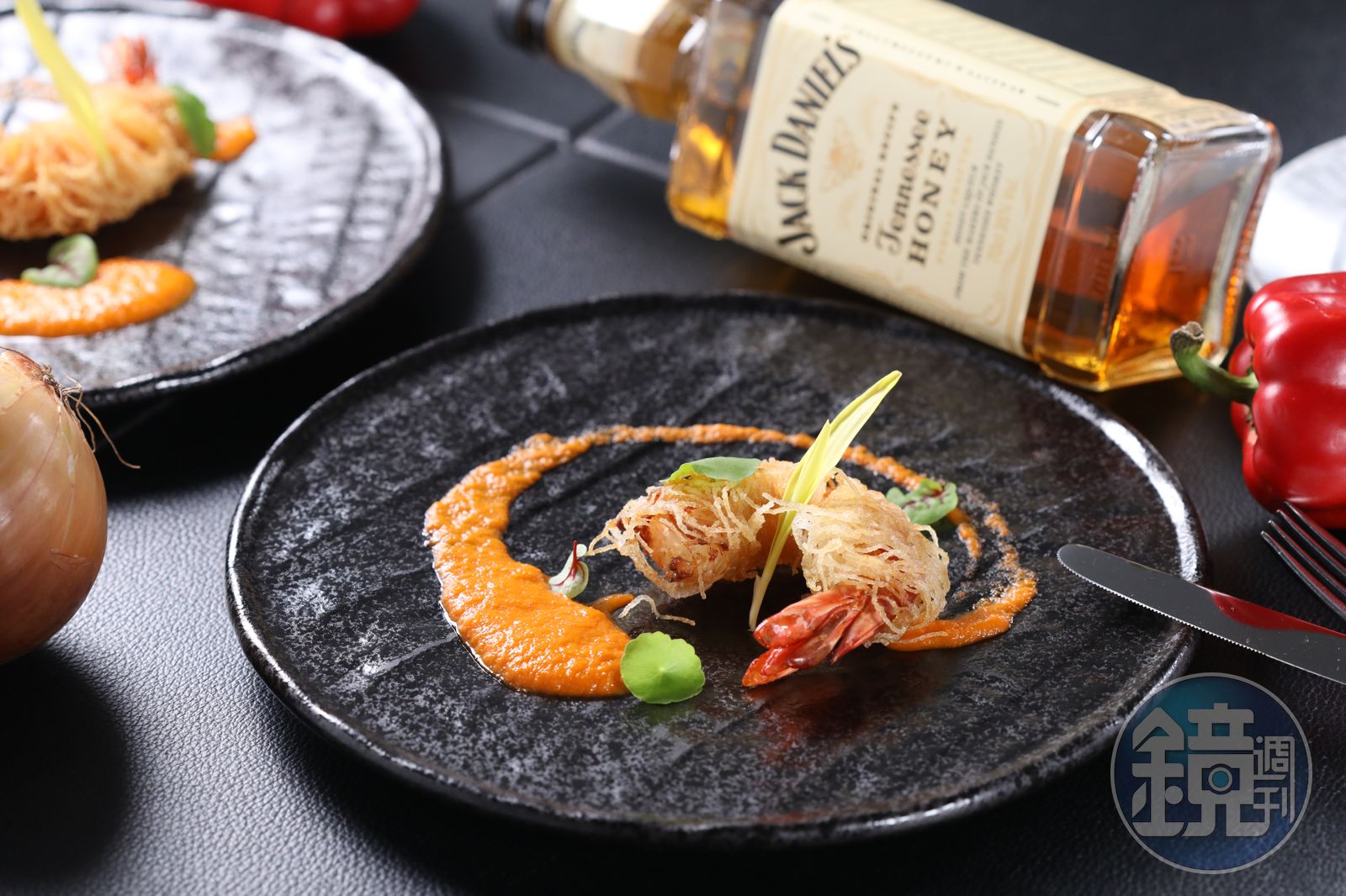 食材:90~100g虎蝦1隻、米粉10g、田納西蜂蜜風味威士忌(Jack Daniel's Tennessee Honey)50ml、紅椒1顆、洋蔥1顆、水20ml、低筋麵粉20g、油和食用花適量。