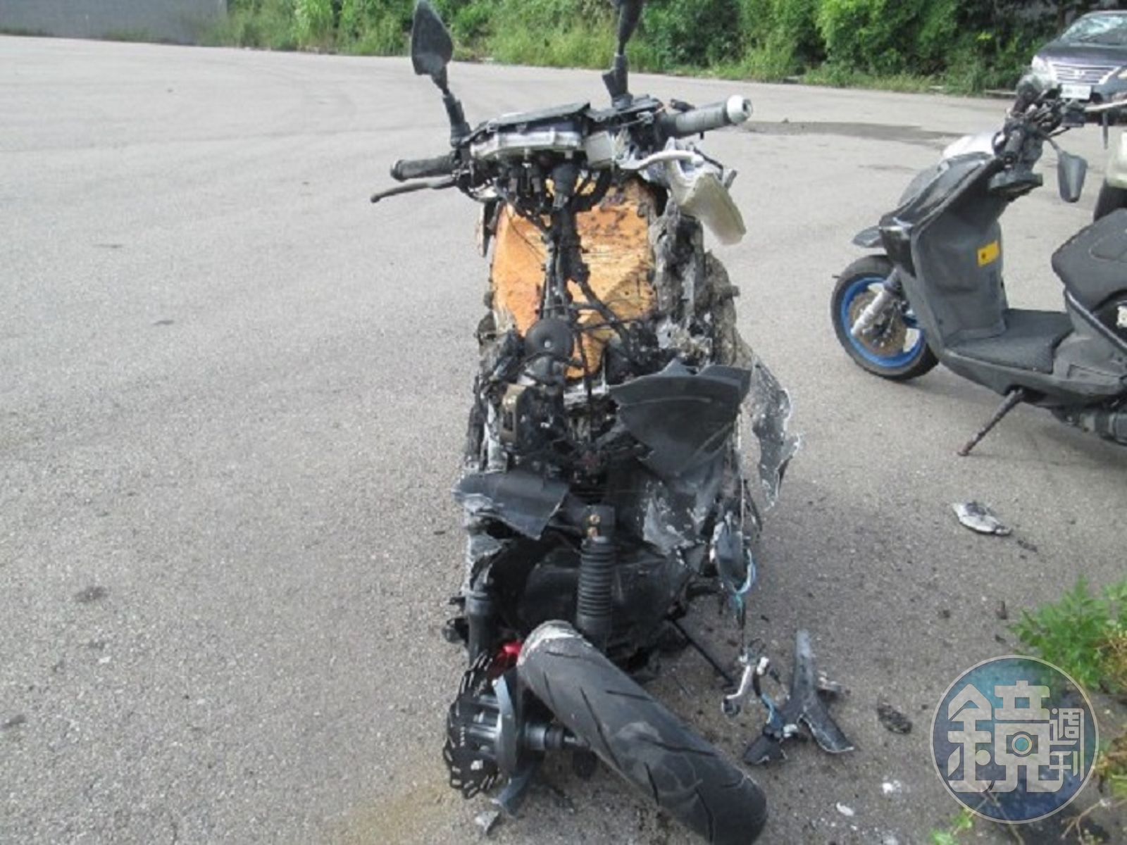 蔡生被撞倒在地,滿臉鮮血,自小客車駕駛(43歲)則毫髮無傷;當時,附近圍觀民眾有人看到機車正在漏油,連忙吆喝伙伴,把傷者扶持到一旁,等待救護車,不到5分鐘,摩托車果然燒了起來,熊熊烈焰吞噬車體,燒得只剩下骨架。