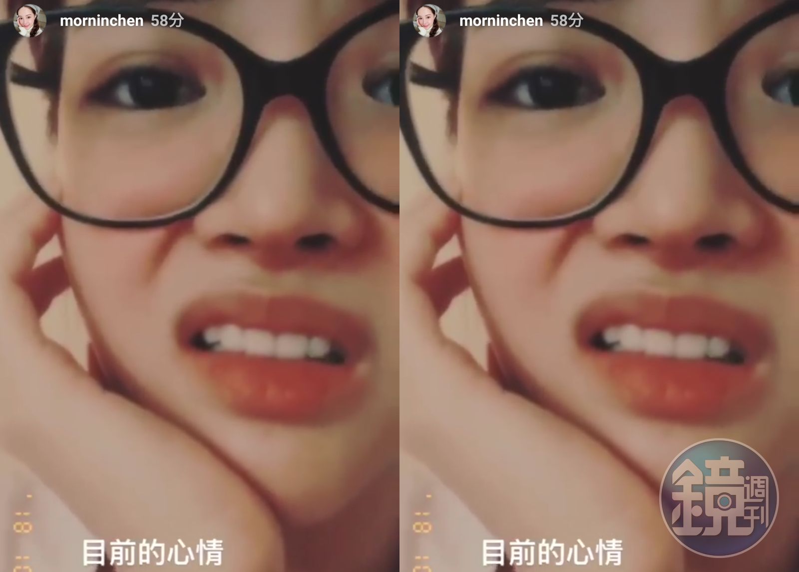 帝寶光頭男友曝光之後,陳夢晨在IG的即時動態抒發自己心情,她一張素臉、戴著黑框眼鏡,並且露牙、壓縮面部肌肉,並且僅寫上「目前的心情」5字,等同默認戀情曝光。