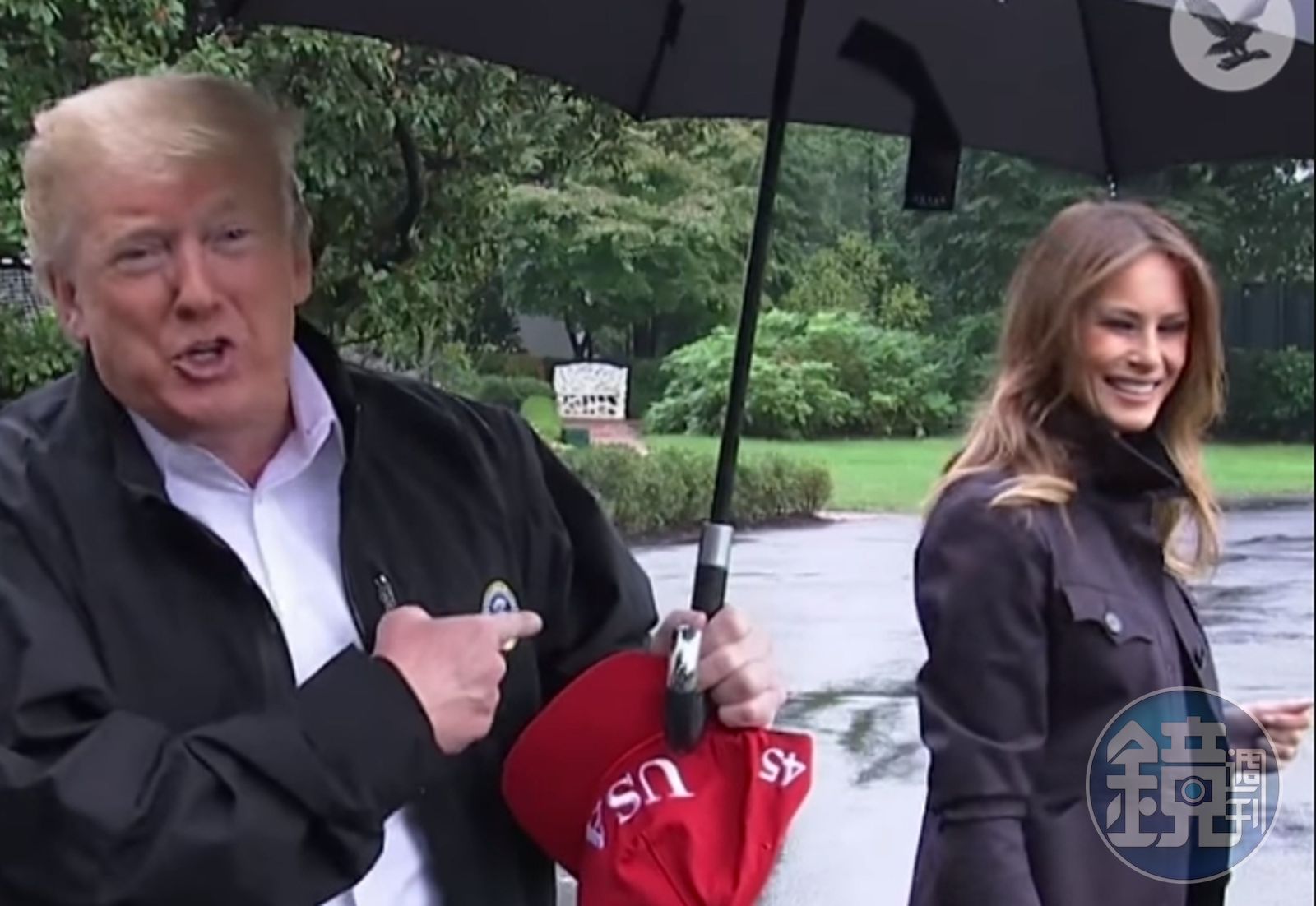 川普向媒體道別轉身後,梅蘭妮亞挽著丈夫的左手臂,川普的傘卻撐在右手,兩人再度併肩同行,卻只有梅蘭妮亞一人走在雨中。