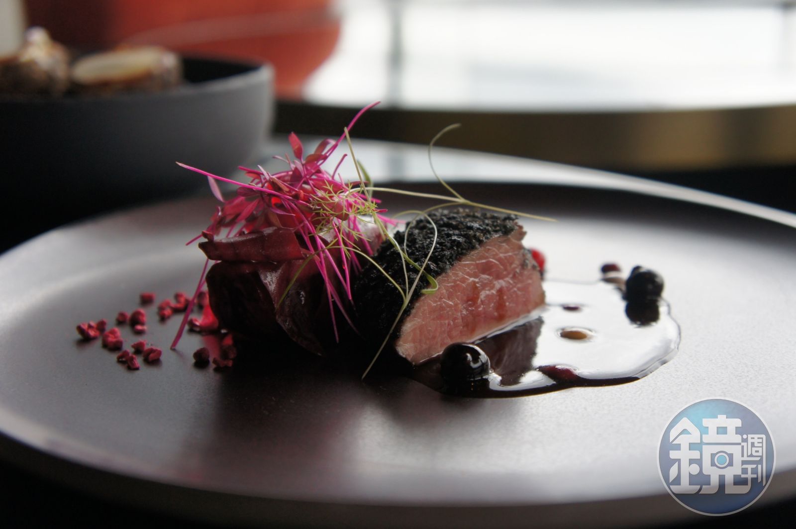 由於土壤還提供水過濾和澄清的作用,Alain就運用Filter(過濾)技法,把高湯沖泡過黑胡椒及香料後,加壓濾製成搭配野味(牛排)的醬汁。